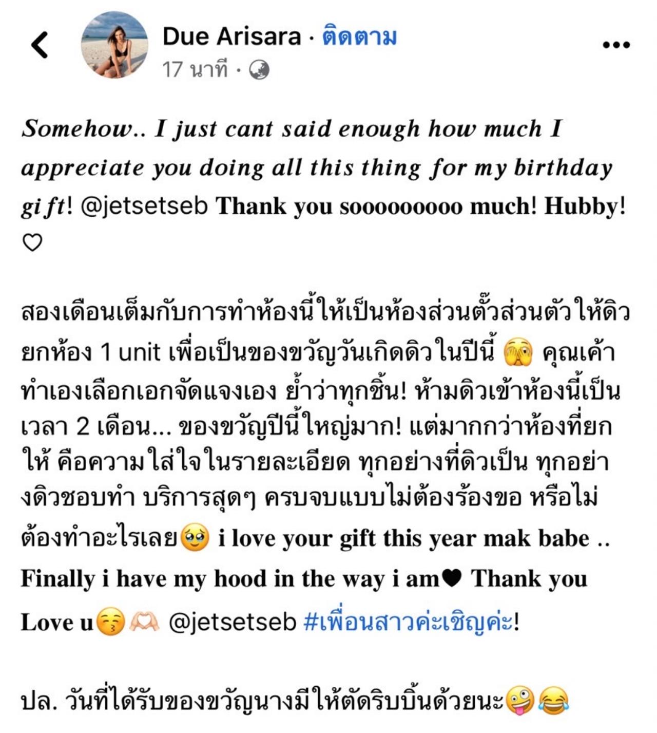 แต่มากกว่าห้องที่ยกให้ คือความใส่ใจในรายละเอียด ทุกอย่างที่ดิวเป็น ทุกอย่างดิวชอบทำ บริการสุดๆ ครบจบแบบไม่ต้องร้องขอ หรือไม่ต้องทำอะไรเลย i love your gift this year mak babe .. Finally i have my crib the way i want Thank you Love u @jetsetseb #เพื่อนสาวค่ะเชิญค่ะ! ปล. วันที่ได้รับของขวัญนางมีให้ตัดริบบิ้นด้วยนะ".