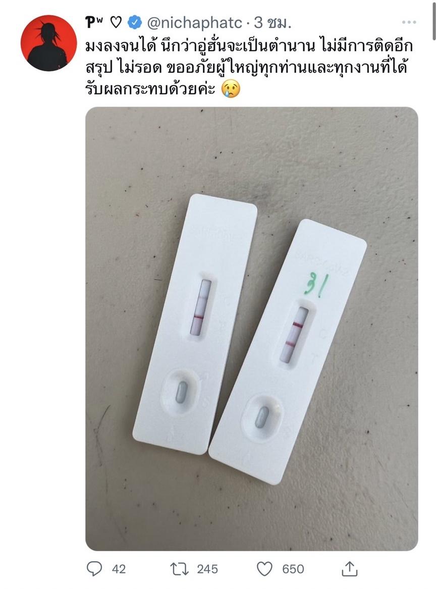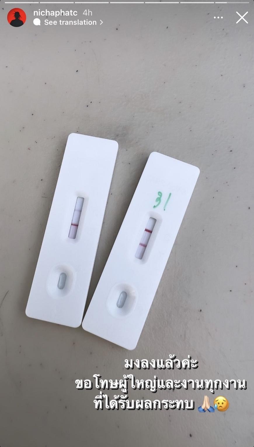 โดย แพรวา ณิชาภัทร โพสต์ภาพผลตรวจ ATK ที่ขึ้น 2 ขีดลงในไอจีสตอรี่ พร้อมทั้งเขียนข้อความว่า “มงลงแล้วค่ะ ขอโทษผู้ใหญ่และงานทุกงานที่ได้รับผลกระทบ” อีกทั้งยังโพสต์ภาพผลตรวจลงในทวิตเตอร์และทวีตข้อความว่า “มงลงจนได้ นึกว่าอู่ฮั่นจะเป็นตำนาน ไม่มีการติดอีก สรุป ไม่รอด ขออภัยผู้ใหญ่ทุกท่านและทุกงานที่ได้รับผลกระทบด้วยค่ะ”