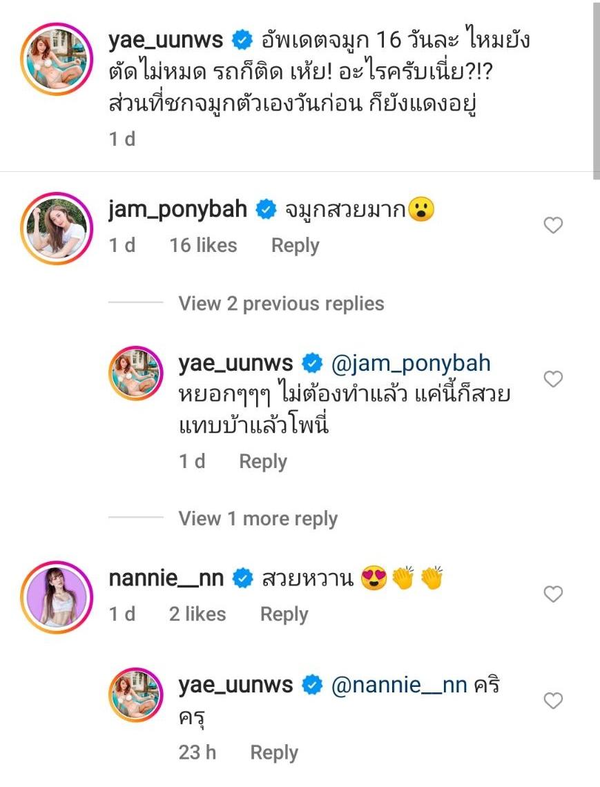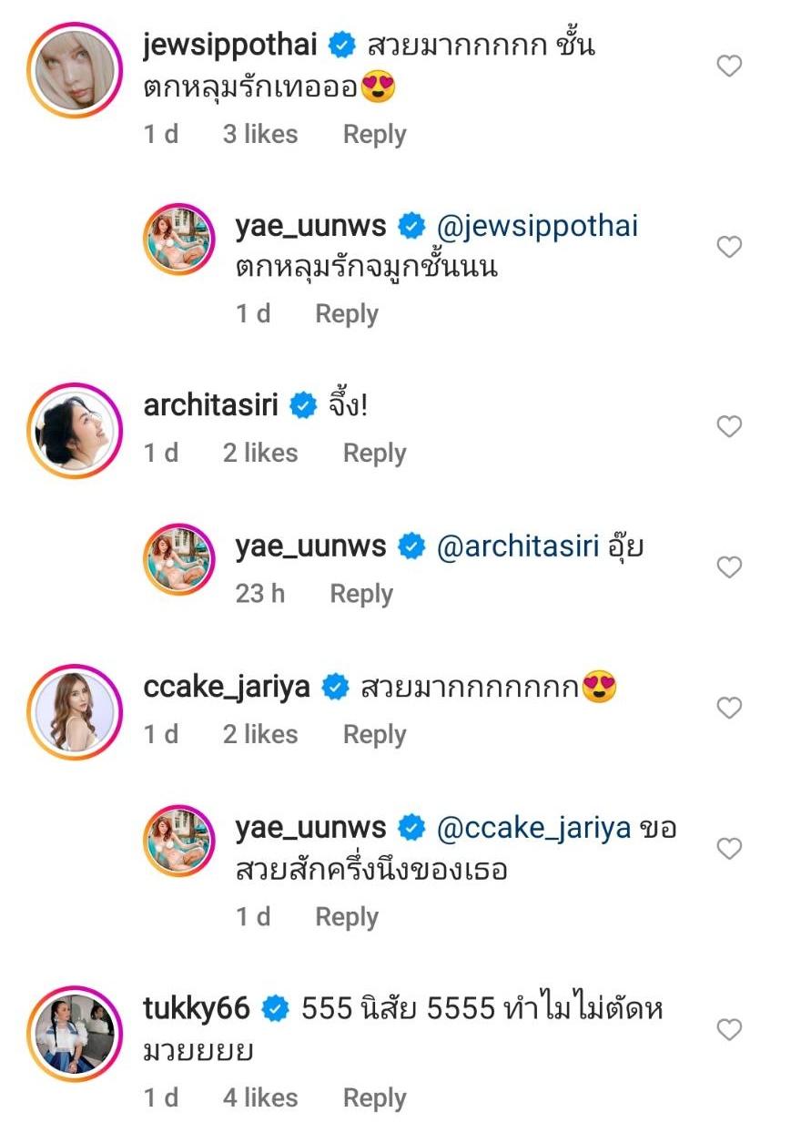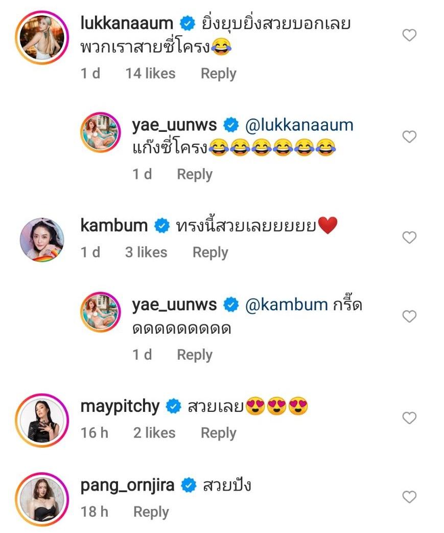 ท่ามกลางคอมเมนต์จากเพื่อนๆ ในวงการบันเทิงรวมถึงชาวเน็ตและแฟนๆ ที่เข้ามาชื่นชมหลายร้อยข้อความ อาทิ ทรงนี้สวยเลยยยยย, สวยปัง, ฉันรักเธอ จมูกนี้ สวยน่ารัก ดูเด็กมาก รับกับทุกส่วนบนใบหน้า ฯลฯ