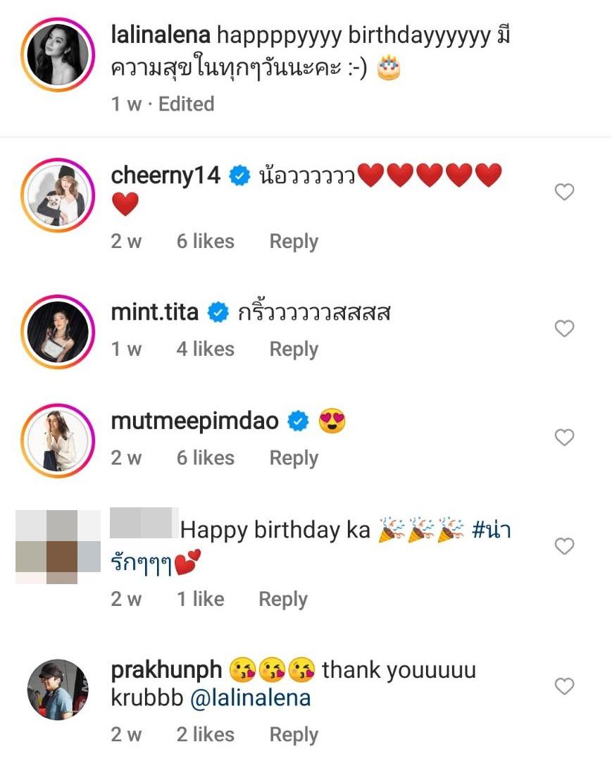 งานนี้ทำเอาเพื่อนๆ ในวงการบันเทิงแซวรัวๆ อาทิ เชียร์ ฑิฆัมพร “น้อวววววว” และใส่อีโมจิรูปหัวใจ, มิ้น มิณฑิตา “กริ้ววววววสสสส”, มัดหมี่ พิมพ์ดาว ส่งอีโมจิตาเป็นรูปหัวใจ ด้านคนในภาพอย่างประคุณก็คอมเมนต์ตอบกลับว่า “thank youuuuu krubbb @lalinalena” และใส่อีโมจิรูปจุ๊บแบบรัวๆ ด้วย.