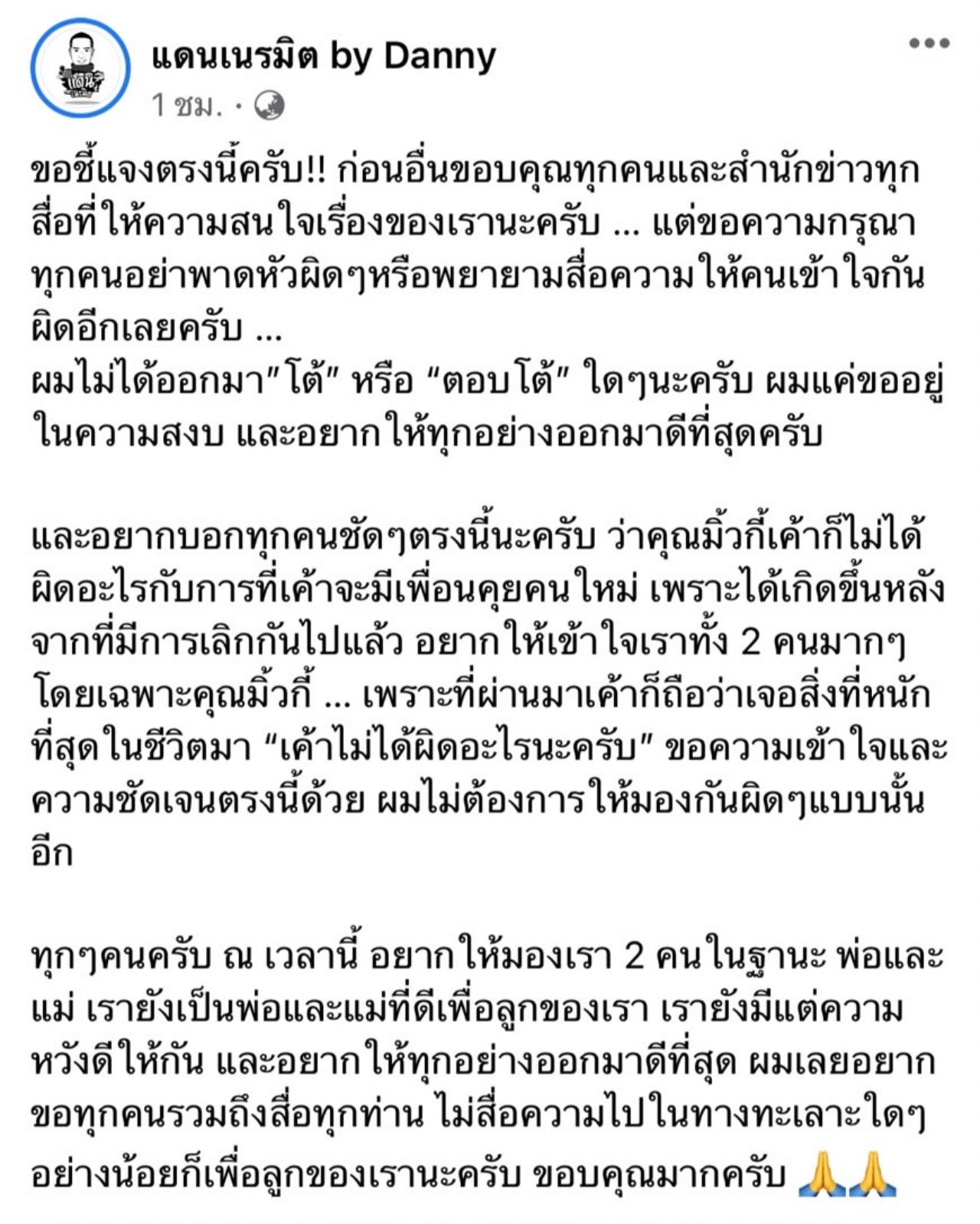 หลังจากที่ มิ้วกี้ โพสต์เรื่องดังกล่าว แดนนี่ เองก็ได้พูดเรื่องนี้ผ่านทางไลฟ์สดขณะที่แฟนๆ ได้สอบถามเข้ามามากมาย โดยบอกว่า เขาเองก็มั่นใจว่าไม่ได้ทำอะไรผิด และอยากให้เรื่องราวเหล่านี้เป็นเรื่องส่วนตัว จึงไม่อยากที่จะออกมาพูดอะไรมาก จากนั้น แดนนี่ ก็ได้โพสต์อีกครั้งอย่างเป็นทางการผ่านทางโซเชียลของตัวเอง พร้อมกับชี้แจงถึงประเด็นดังกล่าวแบบชัดๆ เลยว่า ไม่อยากให้เข้าใจกันผิดต่อไปอีก พร้อมกับบอกว่า มิ้วกี้ ไม่ผิดที่จะมีคนคุยใหม่ เพราะทั้งคู่ได้เลิกรากันไปแล้ว จากนี้ไปก็เหลือสถานะเพียงคนที่หวังดีต่อกัน และเป็นพ่อกับแม่ที่ดีเพื่อลูก