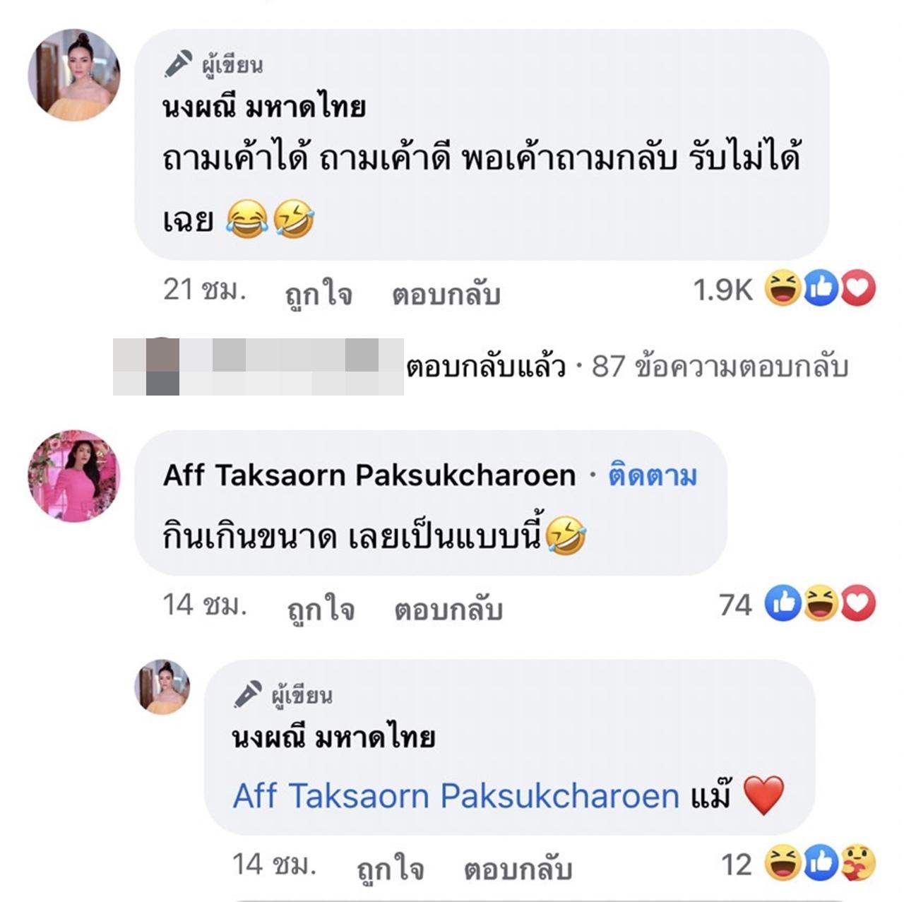 ด้าน แอฟ ทักษอร ก็ได้เข้ามาคอมเมนต์ว่า "กินเกินขนาด เลยเป็นแบบนี้" ซึ่ง จ๊ะ ก็ตอบกลับว่า "แม๊".