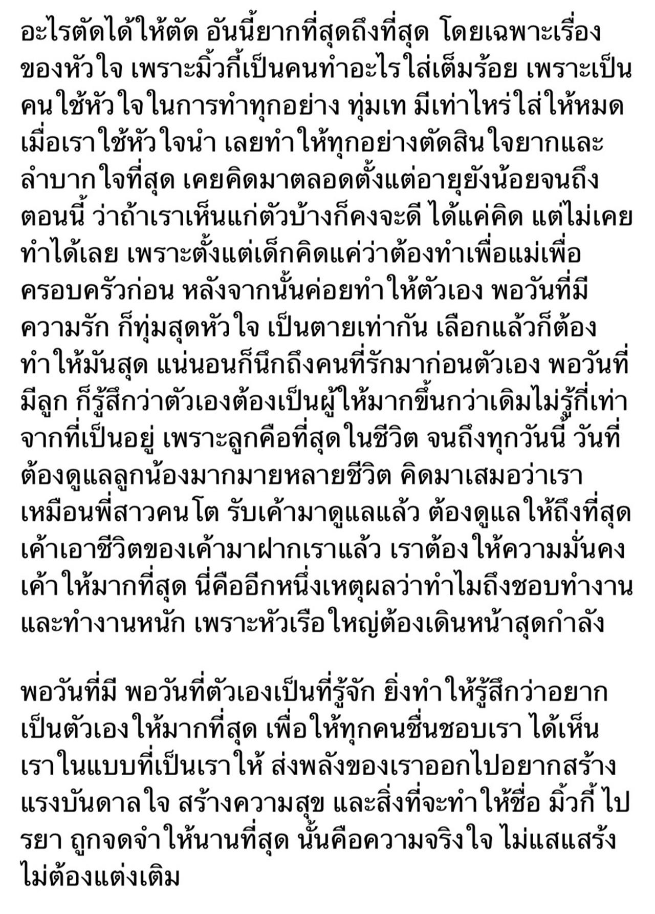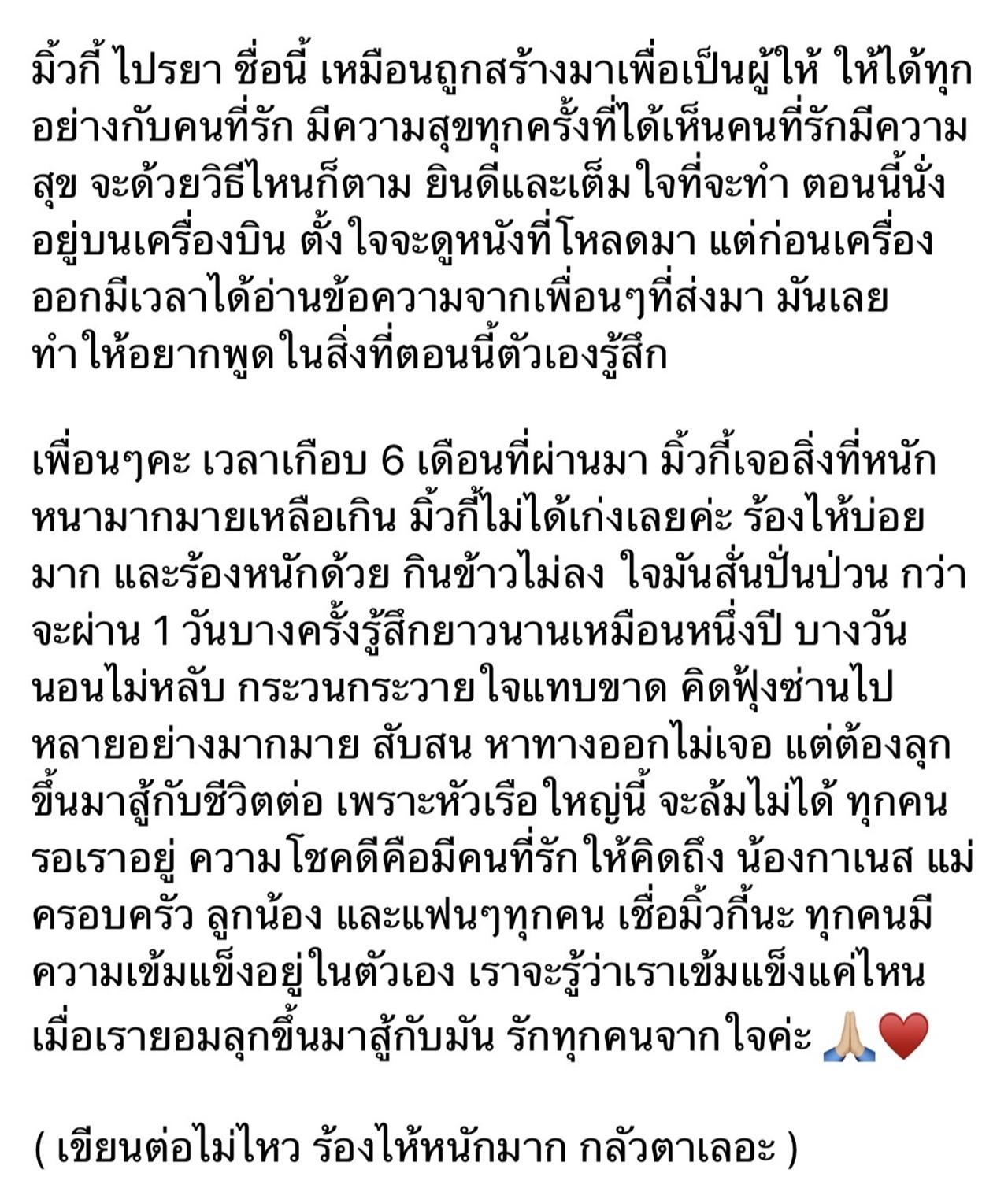 แต่ต้องลุกขึ้นมาสู้กับชีวิตต่อ เพราะหัวเรือใหญ่นี้ จะล้มไม่ได้ ทุกคนรอเราอยู่ ความโชคดีคือมีคนที่รักให้คิดถึง น้องกาเนส แม่ ครอบครัว ลูกน้อง และแฟนๆ ทุกคน เชื่อมิ้วกี้นะ ทุกคนมีความเข้มแข็งอยู่ในตัวเอง เราจะรู้ว่าเราเข้มแข็งแค่ไหน เมื่อเรายอมลุกขึ้นมาสู้กับมัน รักทุกคนจากใจค่ะ (เขียนต่อไม่ไหว ร้องไห้หนักมาก กลัวตาเลอะ)".