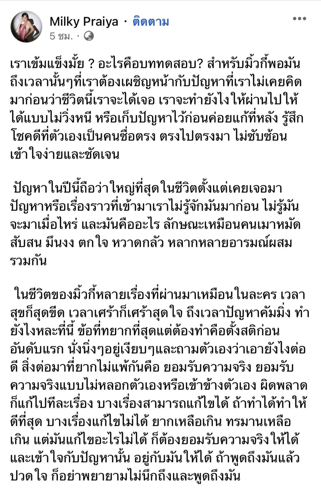 ล่าสุด มิ้วกี้ ก็ได้โพสต์ระบายเรื่องราวของตัวเองตลอด 6 เดือนที่ผ่านมา ว่าทุกๆ วันไม่เคยมีความสุขเลย ร้องไห้ทุกวัน 1 วันยาวนานเหมือน 1 ปี แต่สุดท้ายแล้วเธอก็พยายามลุกขึ้นสู้กับปัญหาทุกอย่าง