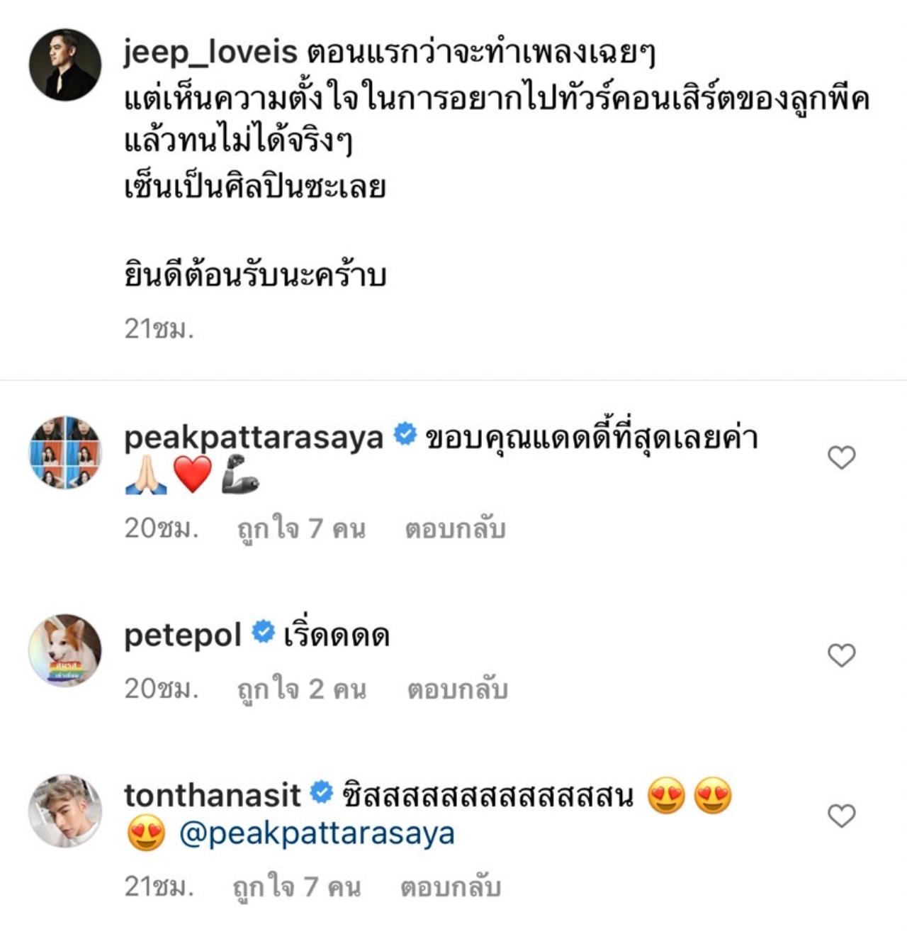 โดย จี๊ป ได้โพสต์ภาพคู่กับ พีค พร้อมเขียนแคปชั่นว่า "ตอนแรกว่าจะทำเพลงเฉยๆ แต่เห็นความตั้งใจในการอยากไปทัวร์คอนเสิร์ตของลูกพีคแล้วทนไม่ได้จริงๆ เซ็นเป็นศิลปินซะเลย ยินดีต้อนรับนะคร้าบ" งานนี้ได้มีเพื่อนๆ ในวงการเพลงได้เข้ามาคอมเมนต์ต้อนรับว่าที่ศิลปินคนใหม่กันเป็นจำนวนมาก.