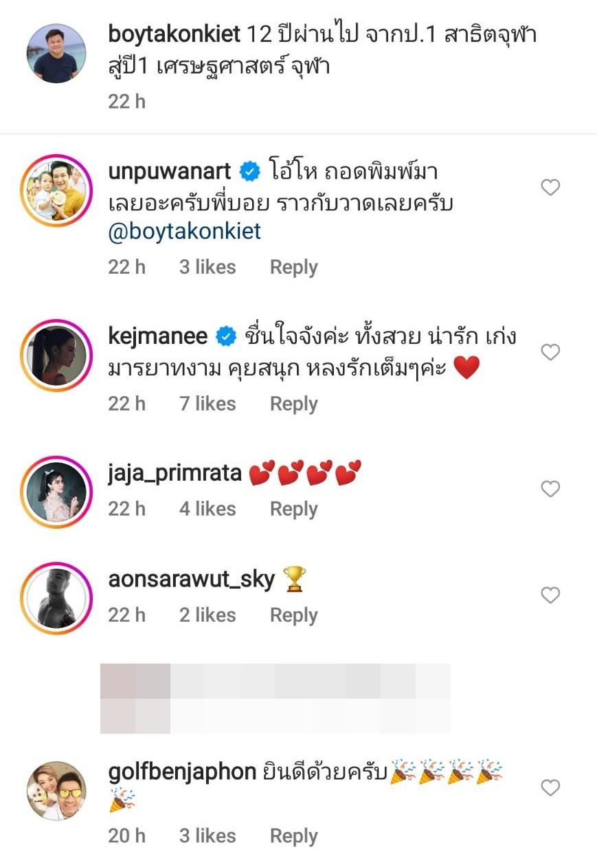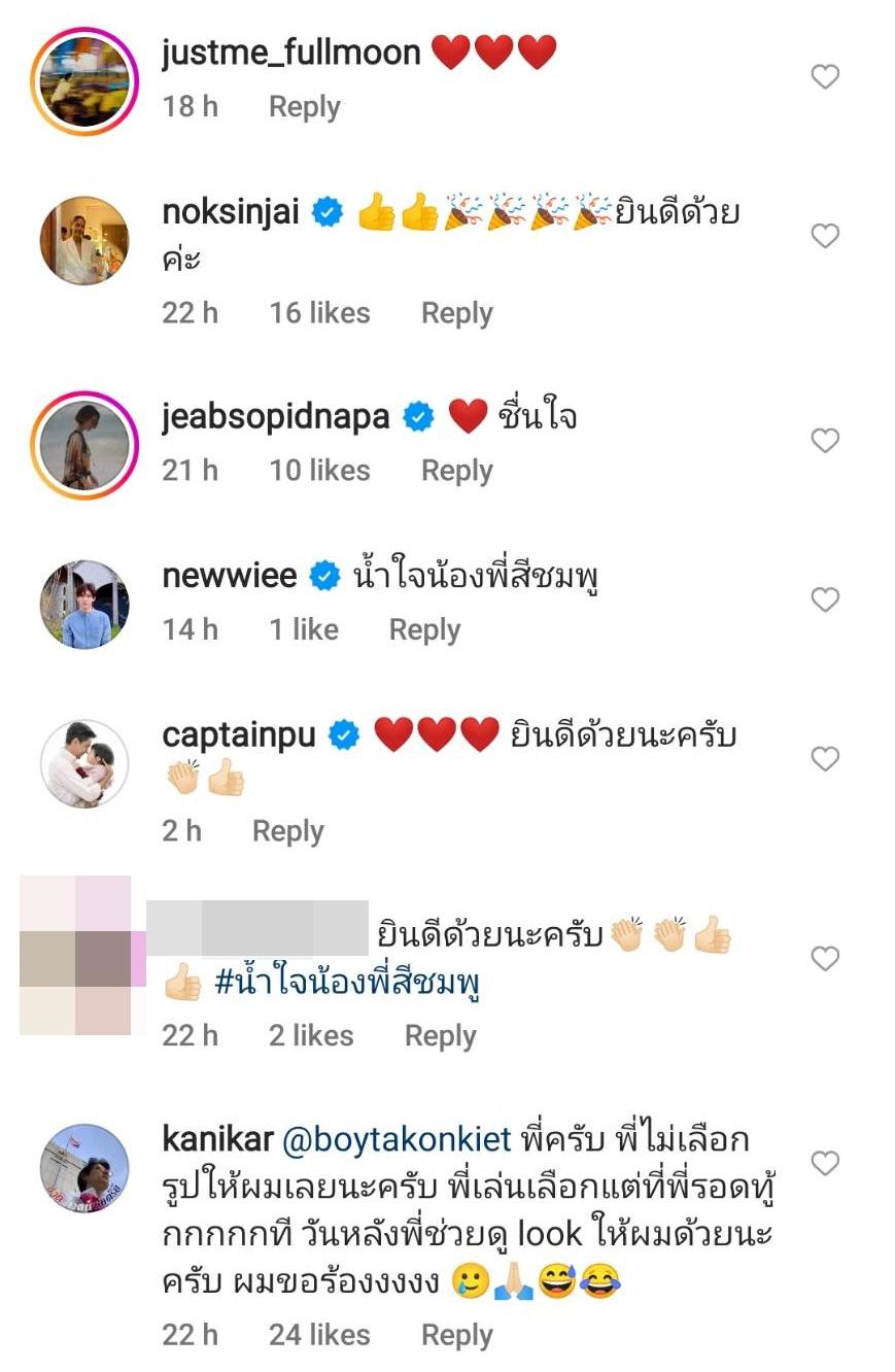 ท่ามกลางคอมเมนต์จากคนในวงการบันเทิง อาทิ อั๋น ภูวนาท “โอ้โห ถอดพิมพ์มาเลยอะครับพี่บอย ราวกับวาดเลยครับ @boytakonkiet”, ปิ่น เก็จมณี “ชื่นใจจังค่ะ ทั้งสวย น่ารัก เก่ง มารยาทงาม คุยสนุก หลงรักเต็มๆค่ะ”, เจี๊ยบ โสภิตนภา “ชื่นใจ”, นิว ฐิติภูมิ “น้ำใจน้องพี่สีชมพู” รวมไปถึงคนในวงการบันเทิงและแฟนๆ ที่แสดงความยินดีเป็นจำนวนมาก