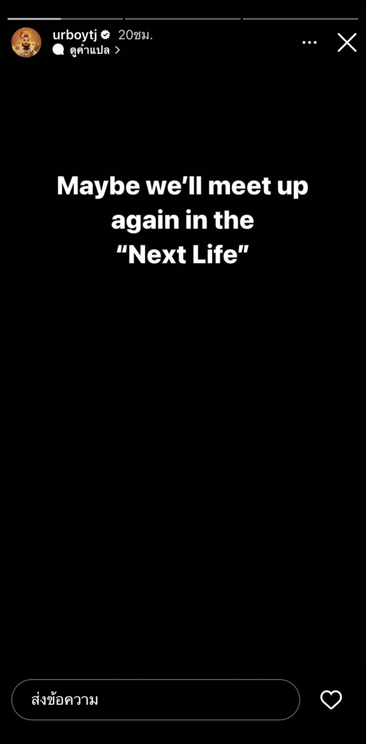 และเมื่อย้อนไปดูในไอจีสตอรี่ของนักร้องหนุ่มชื่อดัง ก็ได้พบข้อความที่ ทีเจ ได้โพสต์เป็นแบล็กกราวนด์สีดำและเขียนข้อความเอาไว้เมื่อ 20 ชั่วโมงก่อนว่า "Maybe we'll meet up again in the "Next Life"" (บางทีเราคงเจอกันอีกทีชาติหน้า) อีกด้วย