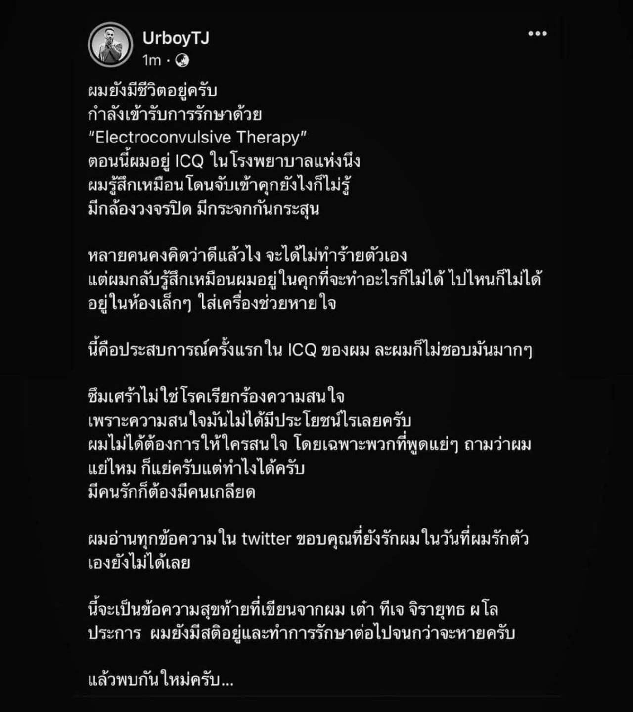 "ผมยังมีชีวิตอยู่ครับ กำลังเข้ารับการรักษาด้วย "Electroconvulsive Therapy" ตอนนี้ผมอยู่ ICU ในโรงพยาบาลแห่งนึง ผมรู้สึกเหมือนโดนจับเข้าคุกยังไงก็ไม่รู้