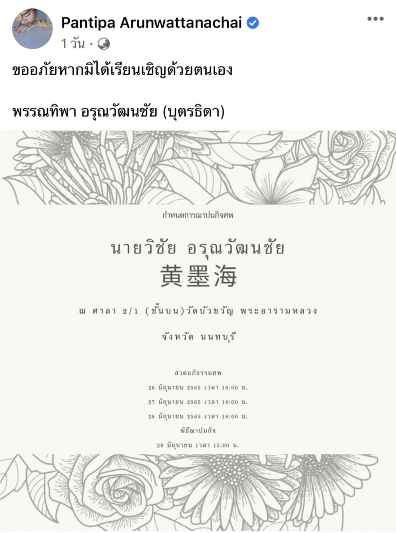 สูญเสียคุณพ่อ วิชัย อรุณวัฒนชัย ไปอย่างไม่มีวันกลับ สำหรับ ปุ้มปุ้ย พรรณทิพา โดยทางครอบครัวได้จัดพิธีสวดอภิธรรม 3 วันคือวันที่ 26-28 มิ.ย. และจะทำพิธีฌาปนกิจในวันที่ 29 มิ.ย. ที่วัดบัวขวัญพระอารามหลวง จังหวัดนนทบุรี