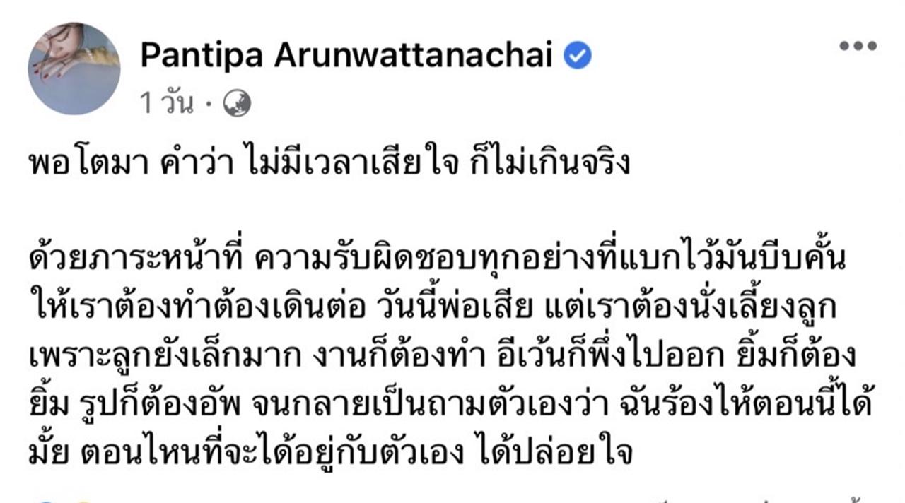 โดย ปุ้มปุ้ย ได้โพสต์ระบายถึงสิ่งที่อัดอั้นในใจผ่านทางเฟซบุ๊กส่วนตัว บอกว่า "พอโตมา คำว่า ไม่มีเวลาเสียใจ ก็ไม่เกินจริงด้วยภาระหน้าที่ ความรับผิดชอบทุกอย่างที่แบกไว้มันบีบคั้น ให้เราต้องทำต้องเดินต่อ วันนี้พ่อเสีย แต่เราต้องนั่งเลี้ยงลูกเพราะลูกยังเล็กมาก งานก็ต้องทำ อีเวนต์ก็เพิ่งไปออก ยิ้มก็ต้องยิ้ม รูปก็ต้องอัพ จนกลายเป็นถามตัวเองว่า ฉันร้องไห้ตอนนี้ได้มั้ย ตอนไหนที่จะได้อยู่กับตัวเอง ได้ปล่อยใจ" ท่ามกลางคนที่ติดตามได้เข้ามาให้กำลังใจกันเป็นจำนวนมาก.