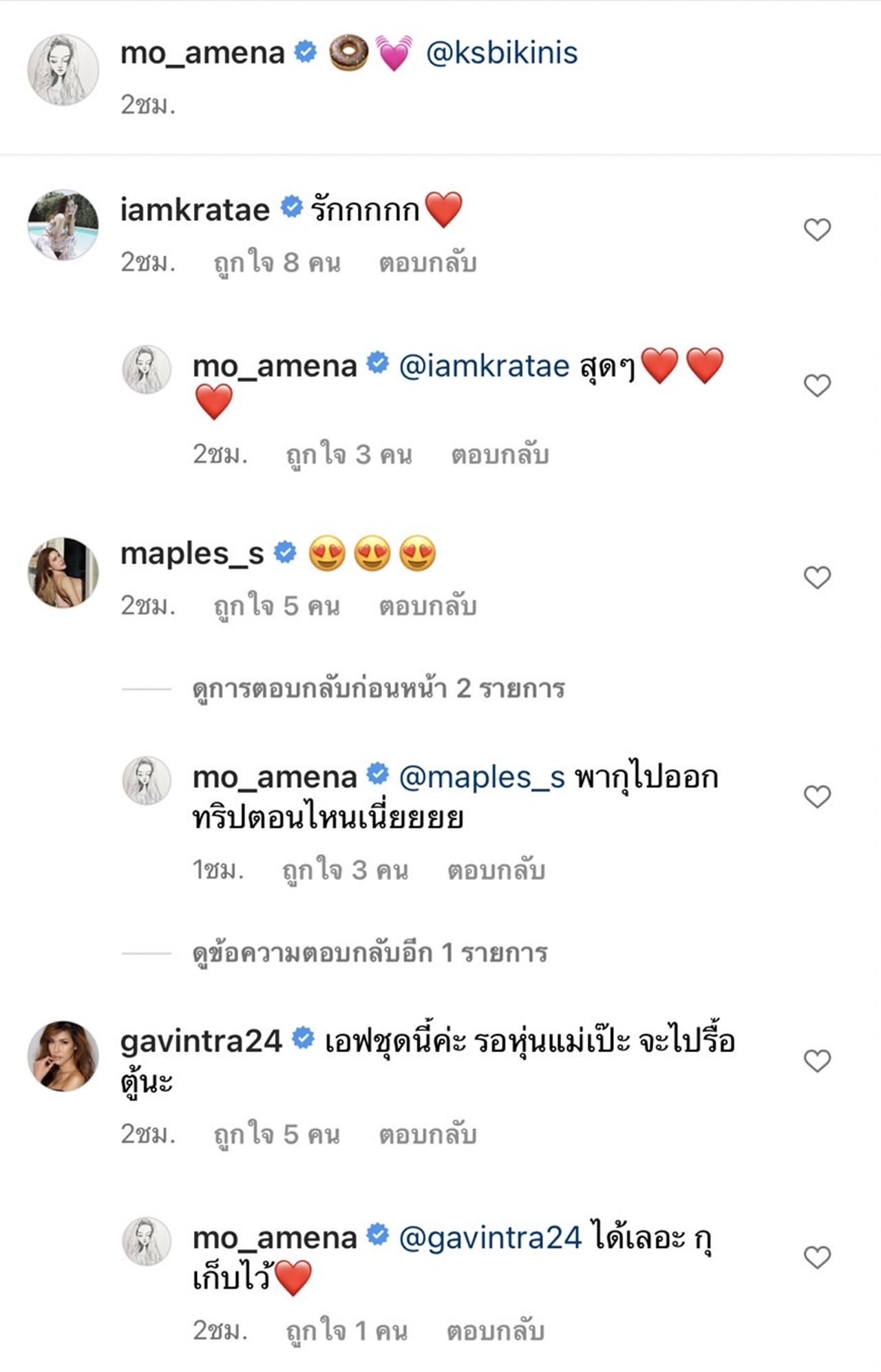 งานนี้เพื่อนๆ และแฟนคลับที่ติดตามต่างเข้ามาคอมเมนต์ชื่นชมในความแซ่บของสาว โม อมีนา รวมไปถึง แก้ม กวินตรา ถึงขั้นขอเอฟชุดนี้ต่อกันเลยทีเดียว "เอฟชุดนี้ค่ะ รอหุ่นแม่เป๊ะ จะไปรื้อตู้นะ".