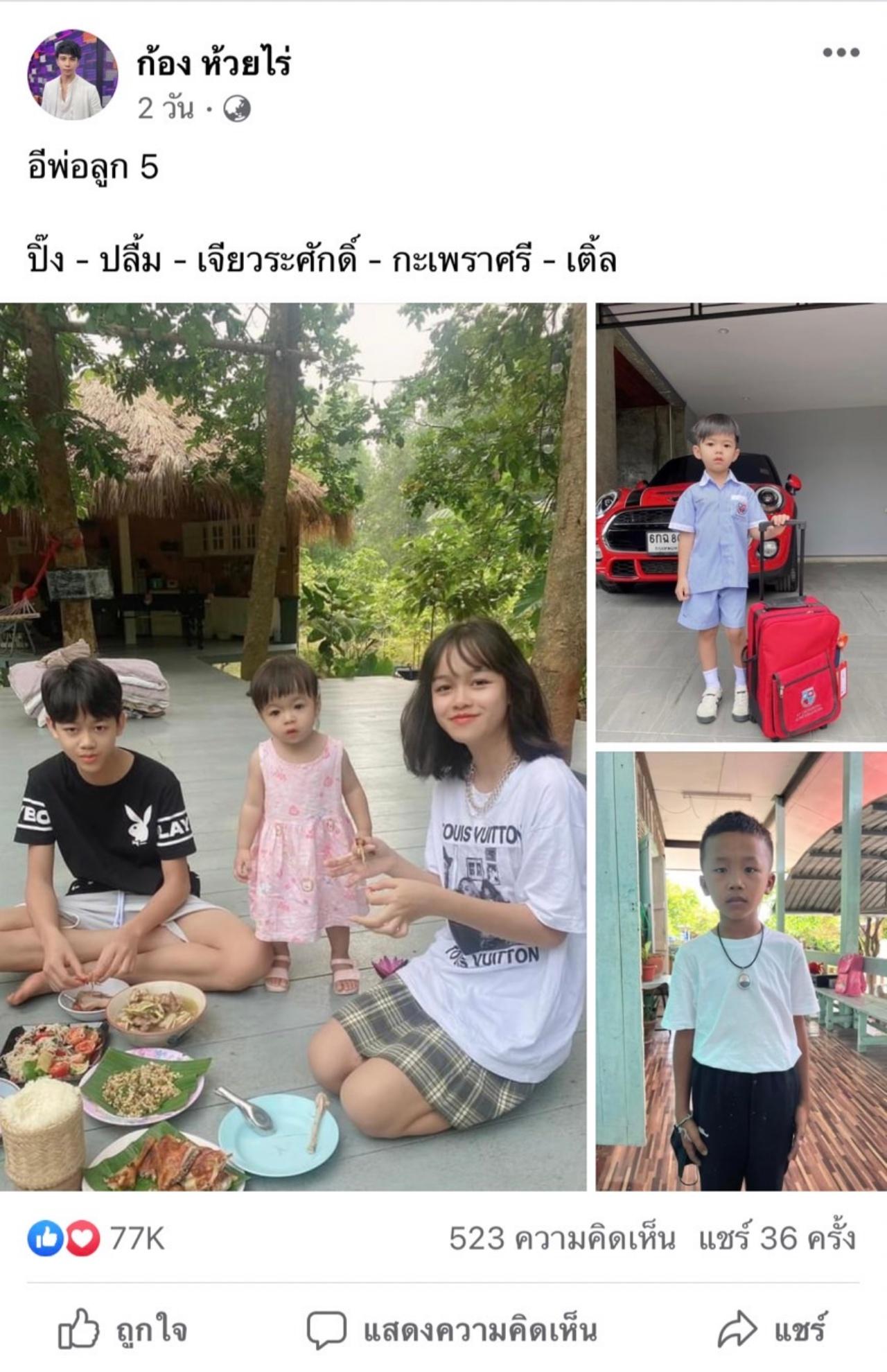 คอมเมนต์แทบแตก เมื่อ ก้อง ห้วยไร่ คุณพ่อลูกดกขออวดลูกๆ ของตัวเองลงในเฟซบุ๊ก โดยเจ้าตัวได้โพสต์รูปเด็กๆ 5 คน พร้อมแคปชั่นว่า "อีพ่อลูก 5 ปิ๊ง-ปลื้ม-เจียวระศักดิ์-กะเพราศรี-เติ้ล"