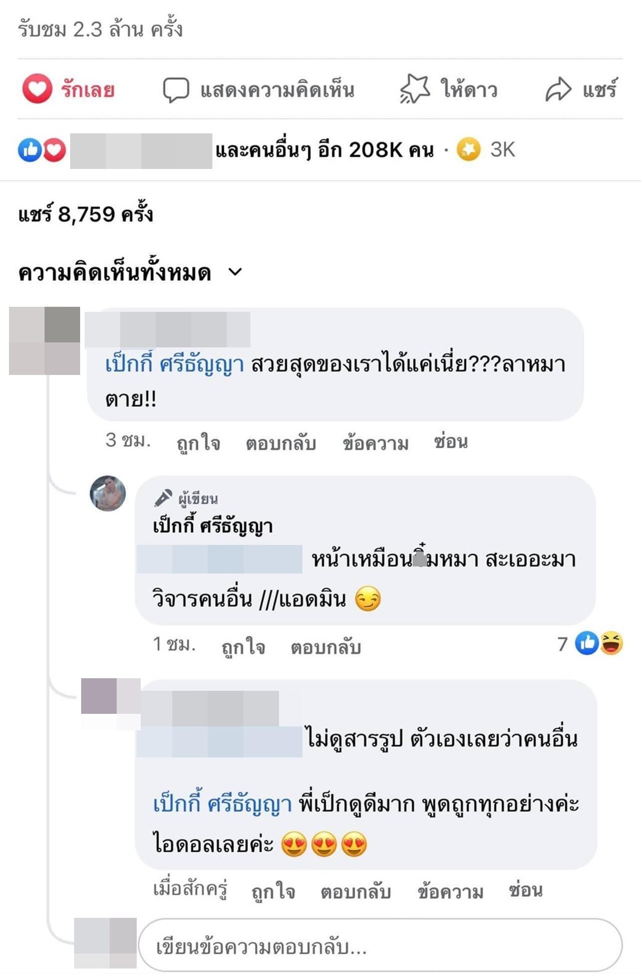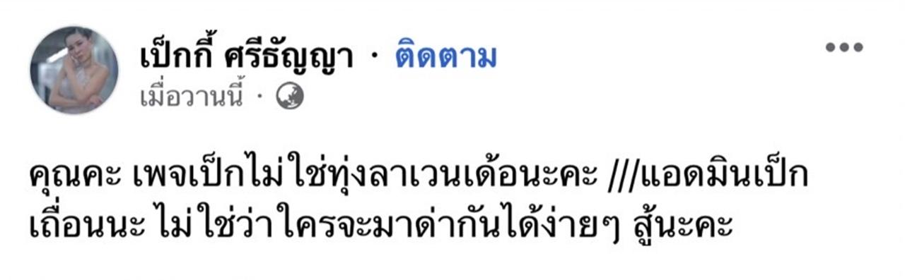 ล่าสุด เป็กกี้ ศรีธัญญา ก็ได้โพสต์ข้อความเตือนคนที่ชอบเข้ามาด่าเธอว่า "คุณคะ เพจเป็กไม่ใช่ทุ่งลาเวนเด้อนะคะ แอดมินเป็กเถื่อนนะ ไม่ใช่ว่าใครจะมาด่ากันได้ง่ายๆ สู้นะคะ" พร้อมกับแคปรูปที่มีชาวเน็ตคนหนึ่งได้เข้ามาคอมเมนต์แซะแรงว่า "สวยสุดของเราได้แค่เนี่ย???ลาหมาตาย!!"