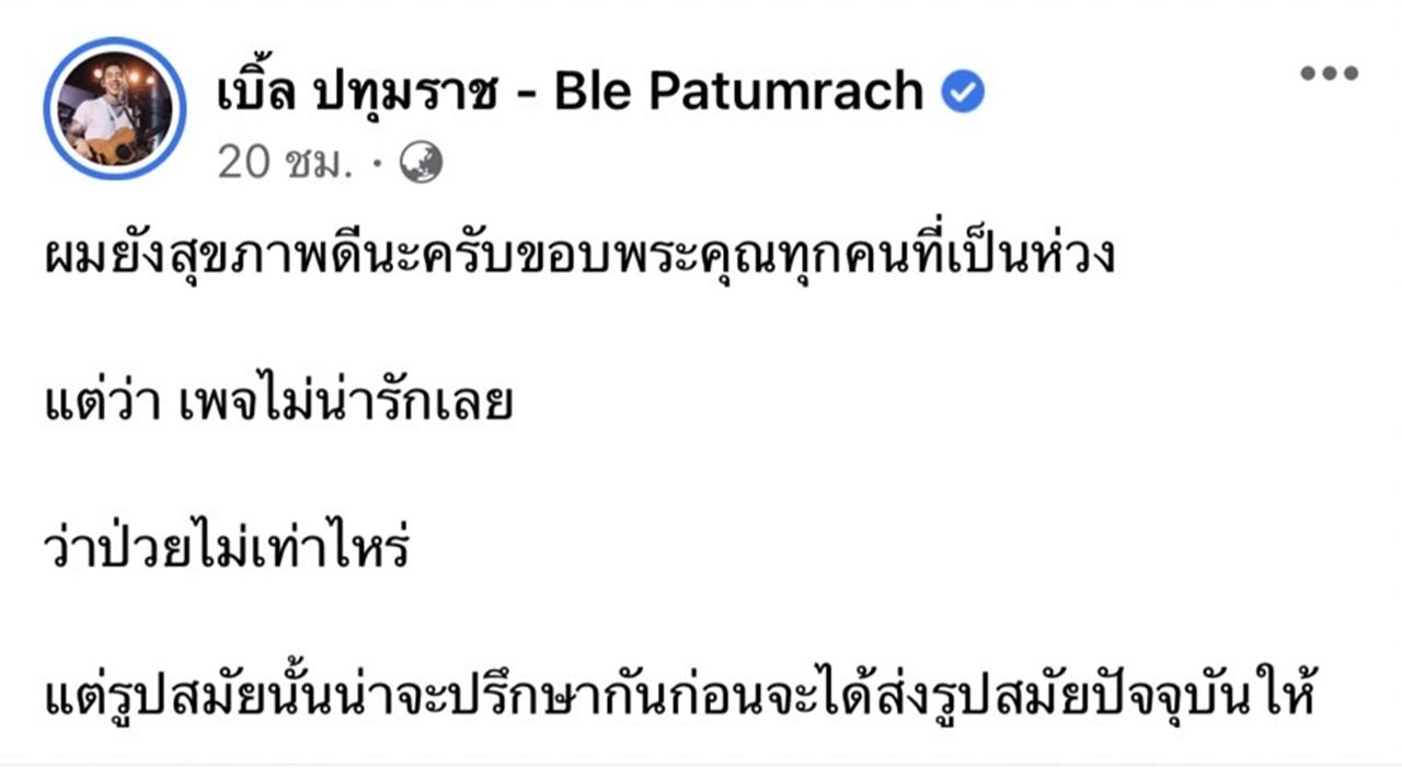 "ผมยังสุขภาพดีนะครับขอบพระคุณทุกคนที่เป็นห่วง แต่ว่าเพจไม่น่ารักเลยว่าป่วยไม่เท่าไร แต่รูปสมัยนั้นน่าจะปรึกษากันก่อน จะได้ส่งรูปสมัยปัจจุบันให้"