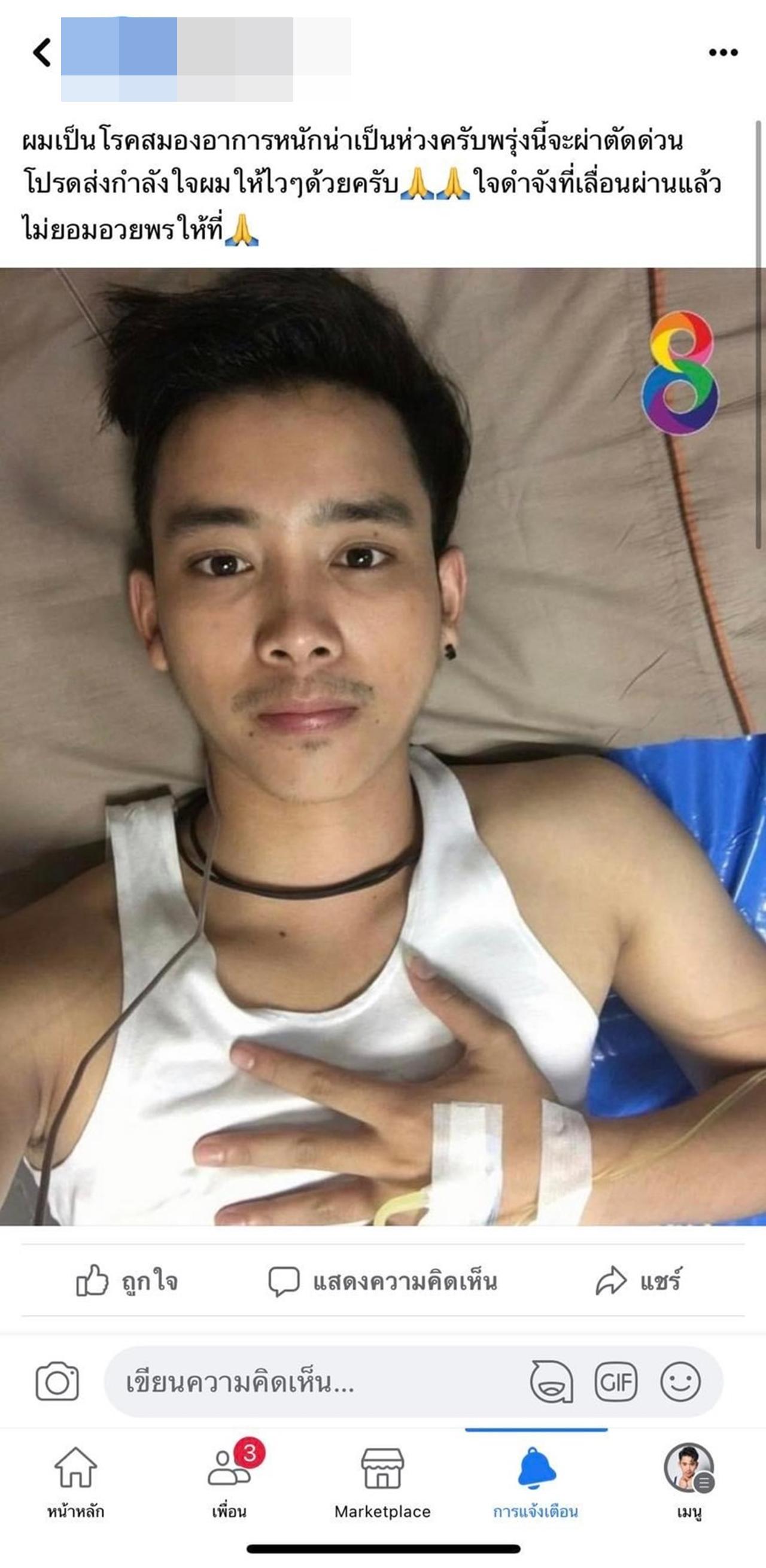 "ผมเป็นโรคสมองอาการหนัก น่าเป็นห่วงครับ พรุ่งนี้จะผ่าตัดด่วน โปรดส่งกำลังใจผมให้หายไวๆ ด้วยครับ ใจดำจังที่เลื่อนผ่านแล้วไม่ยอมอวยพรให้"