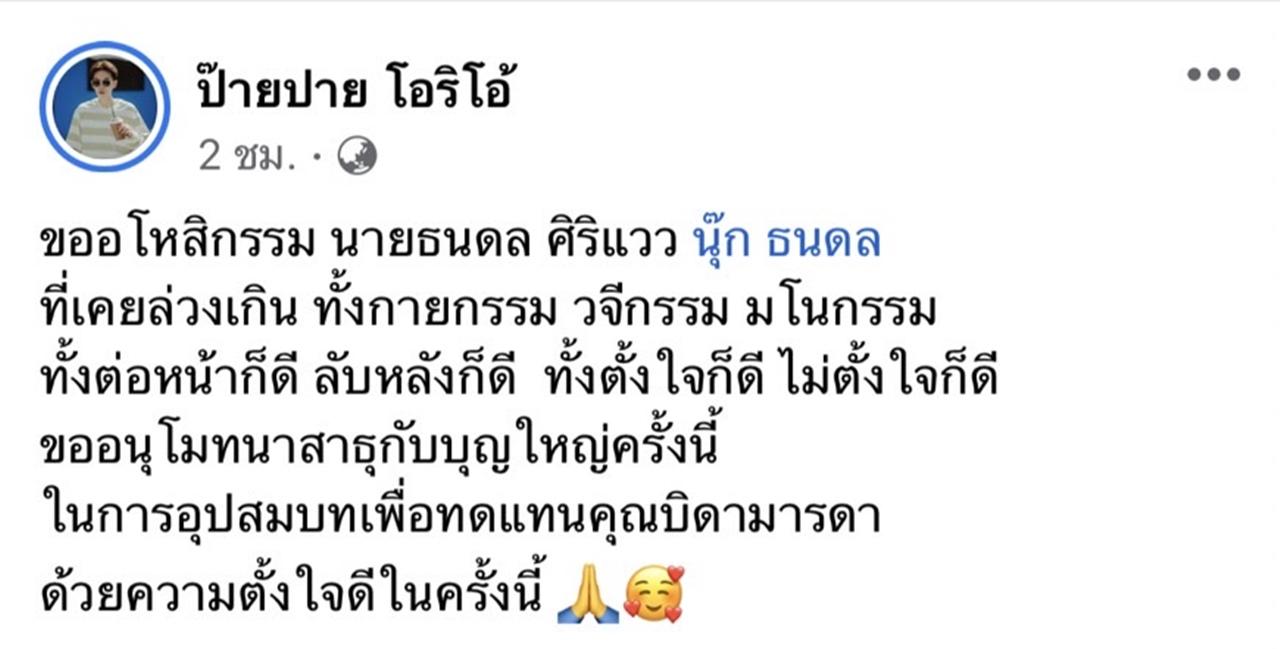 "ขออโหสิกรรม นายธนดล ศิริแวว นุ๊ก ธนดล ที่เคยล่วงเกิน ทั้งกายกรรม วจีกรรม มโนกรรม ทั้งต่อหน้าก็ดี ลับหลังก็ดี ทั้งตั้งใจก็ดี ไม่ตั้งใจก็ดี ขออนุโมทนาสาธุกับบุญใหญ่ครั้งนี้ ในการอุปสมบทเพื่อทดแทนคุณบิดามารดา ด้วยความตั้งใจดีในครั้งนี้"