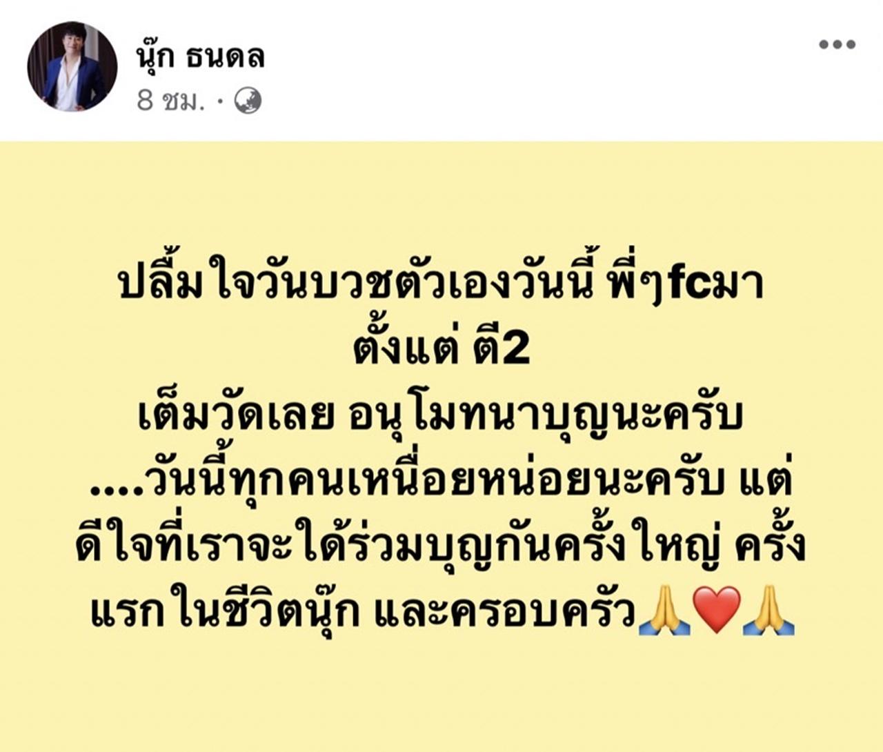 "ปลื้มใจวันบวชตัวเองวันนี้ พี่ๆfcมาตั้งแต่ ตี2 เต็มวัดเลย อนุโมทนาบุญนะครับ ….วันนี้ทุกคนเหนื่อยหน่อยนะครับ แต่ ดีใจที่เราจะได้ร่วมบุญกันครั้งใหญ่ ครั้งแรกในชีวิตนุ๊ก และครอบครัว"