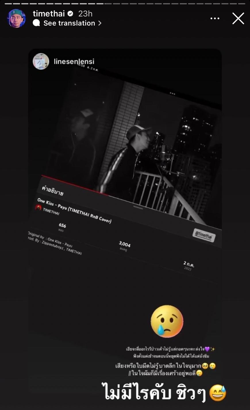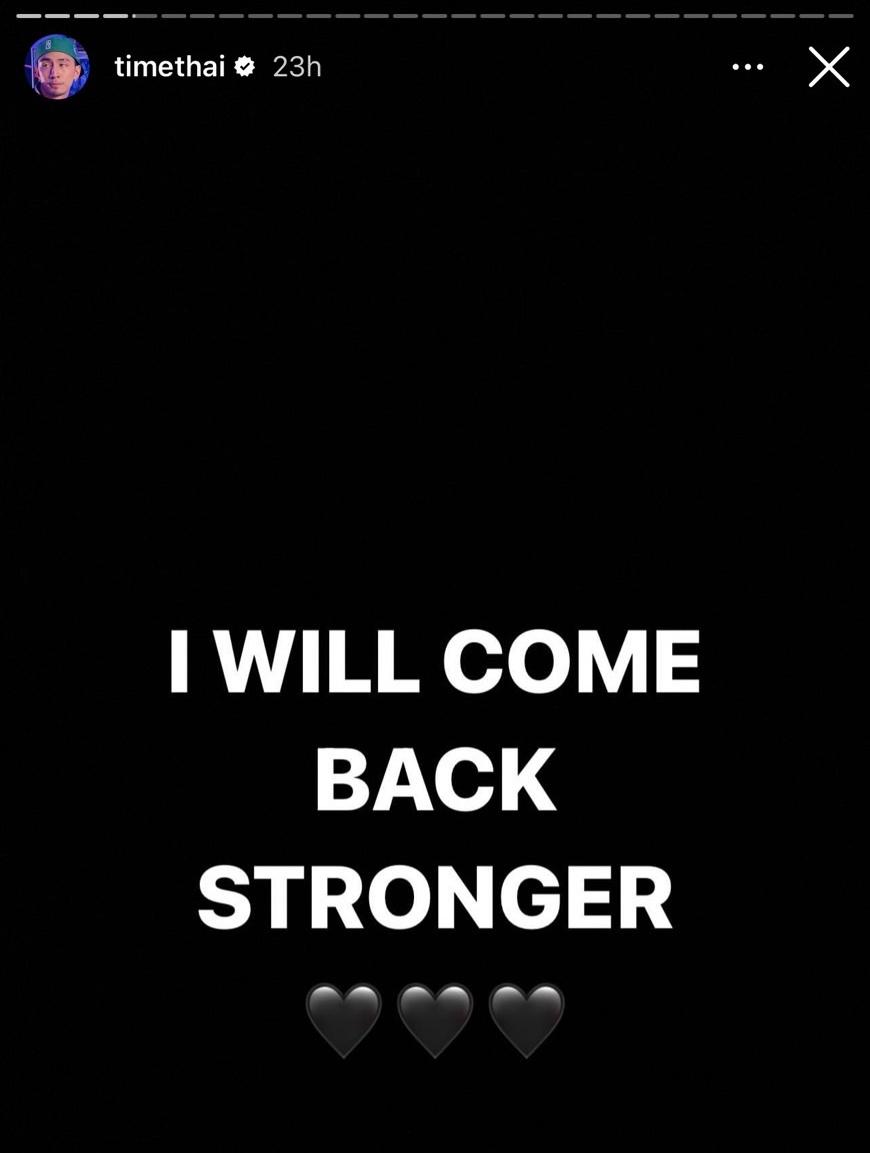 และในไอจีสตอรี่ของธามไทก็ได้โพสต์ข้อความว่า “I will come back stronger” ซึ่งแปลว่า ฉันจะกลับมาแข็งแกร่งขึ้น พร้อมทั้งใส่อีโมจิสีดำ ก่อนจะแชร์สตอรี่จากแฟนๆ ที่เขียนข้อความหลังได้ฟังเพลง One Kiss ที่ธามไทร้องคัฟเวอร์ว่า “เฮียจะสื่ออะไรรึป่าวเค้าไม่รู้ แต่กอดๆ นะคะส่งใจ ฟังตั้งแต่เช้าจนตอนนี้หยุดฟังไม่ได้ ได้แต่นั่งซึม เสียงหรือใบมีดไม่รู้บาดลึกในใจนุมาก ในใจผ๊มก็มีเรื่องเศร้าอยู่พอดี” และธามไทก็ตอบกลับไปว่า “ไม่มีไรคับ ชิวๆ” พร้อมทั้งใส่อีโมจิเหงื่อตกด้วย.