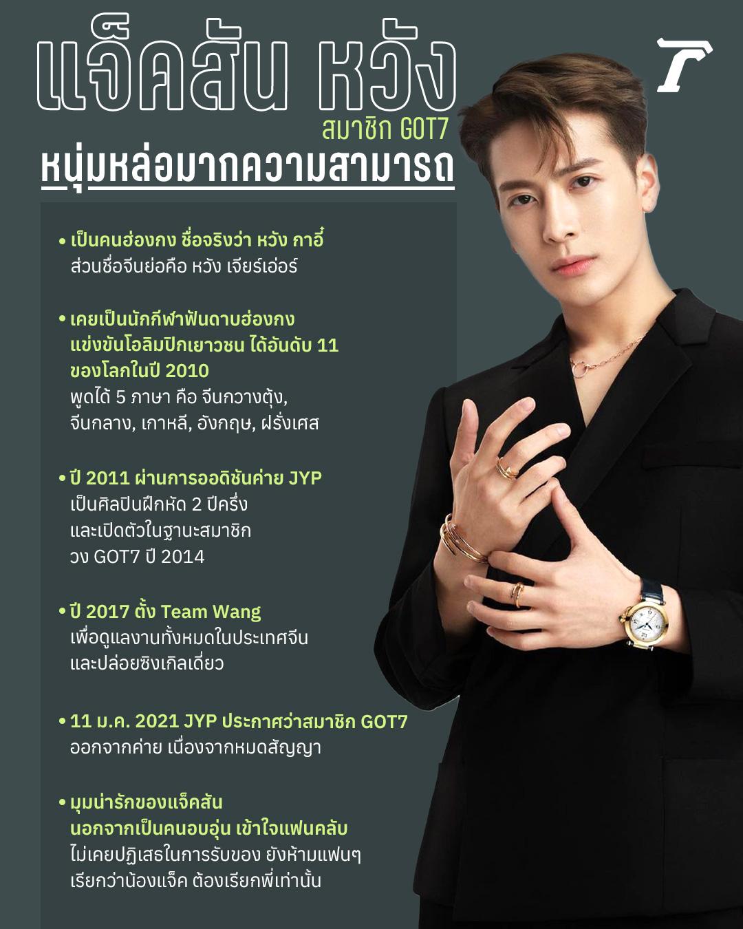 บินลัดฟ้ามาเมืองไทยแล้ว และแฮชแท็ก #WelcomejacksonToThailand ติดเทรนด์ทวิตเตอร์ไทยอย่างรวดเร็ว สำหรับนักร้องหนุ่มหล่อเท่มากความสามารถ แจ็คสัน หวัง หนึ่งในสมาชิกวงไอดอลดังจากเกาหลี GOT7 ที่นอกจากจะเป็นขวัญใจแฟนๆ ในเกาหลีใต้แล้ว ยังเป็นศิลปินที่โด่งดังในอีกหลายประเทศ รวมถึงประเทศไทย บันเทิงไทยรัฐออนไลน์พาไปทำความรู้จักกับหนุ่มคนนี้ถึงประวัติและผลงานเด่นๆ ที่ผ่านมา