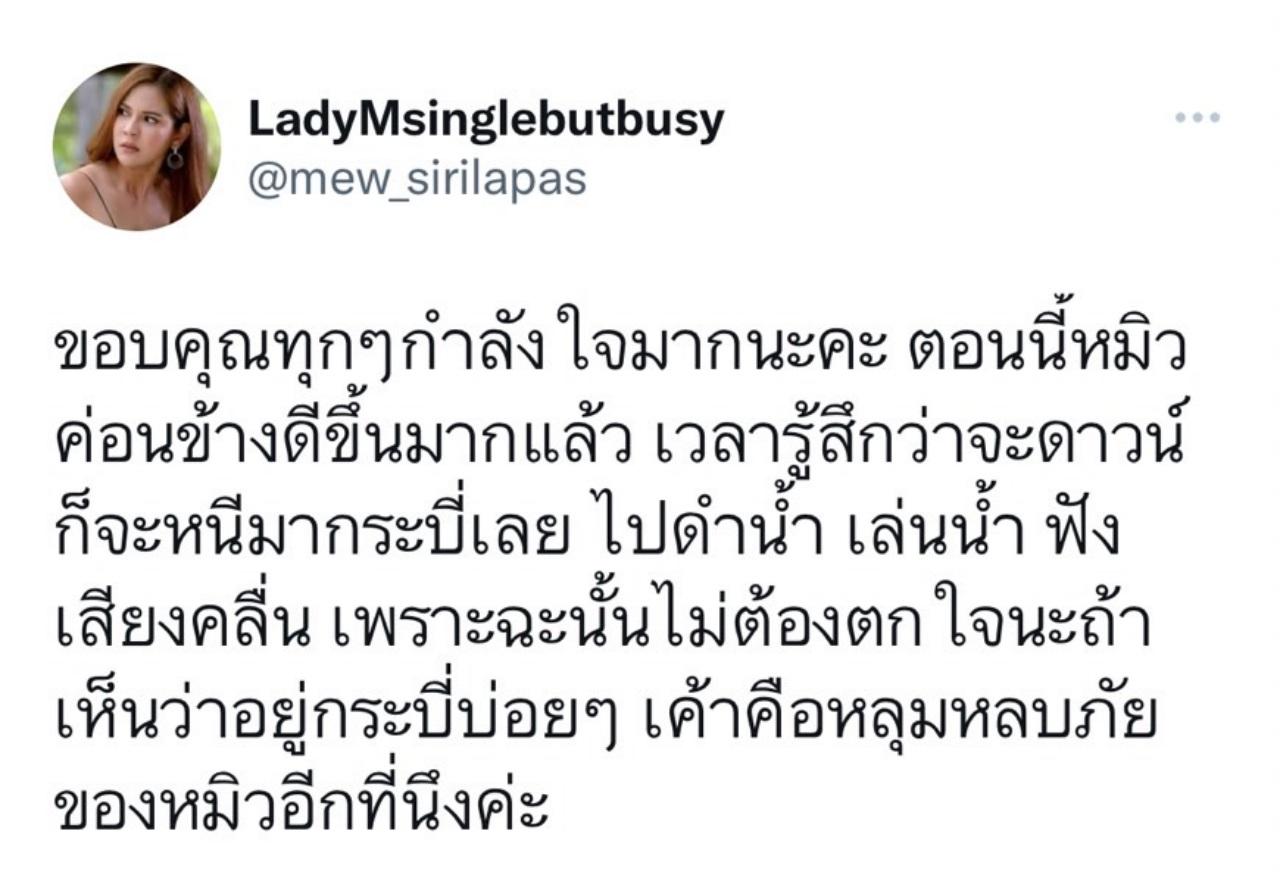 จากนั้น หมิว ก็ได้โพสต์ขอบคุณทุกกำลังใจ และตอนนี้ตนเองดีขึ้นมากแล้ว "ขอบคุณทุกๆกำลังใจมากนะคะ ตอนนี้หมิวค่อนข้างดีขึ้นมากแล้ว เวลารู้สึกว่าจะดาวน์ก็จะหนีมากระบี่เลย ไปดำน้ำ เล่นน้ำ ฟังเสียงคลื่น เพราะฉะนั้นไม่ต้องตกใจนะถ้าเห็นว่าอยู่กระบี่บ่อยๆ เค้าคือหลุมหลบภัยของหมิวอีกที่นึงค่ะ".