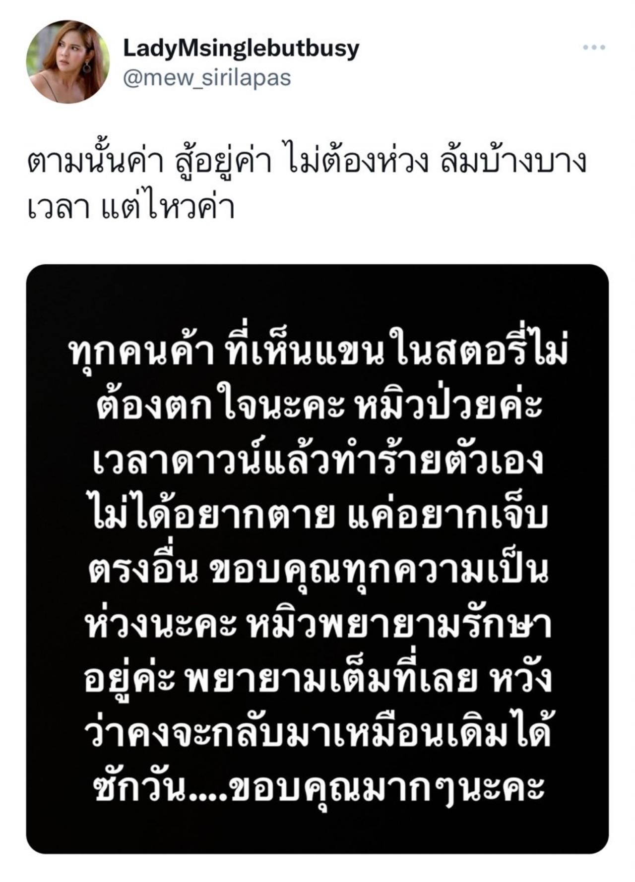 "ทุกคนค้า ที่เห็นแขนในสตอรี่ไม่ต้องตกใจนะคะ หมิวป่วยค่ะเวลาดาวน์แล้ว ทำร้ายตัวเอง ไม่ได้อยากตาย แค่อยากเจ็บตรงอื่น ขอบคุณทุกความเป็นห่วงนะคะ หมิวพยายามรักษาอยู่ค่ะ พยายามเต็มที่เลย หวังว่าคงจะกลับมาเหมือนเดิมได้ซักวัน...ขอบคุณมากๆนะคะ"
