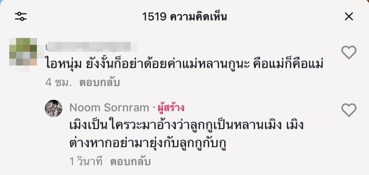 "ไอหนุ่ม ยังไงก็อย่าด้อยค่าแม่หลานกูนะ แม่ก็คือแม่" ซึ่ง หนุ่ม ศรราม ก็ได้มาคอมเมนต์ตอบกลับชาวเน็ตคนดังกล่าวว่า "เxงเป็นใครวะ มาอ้างว่าลูกกูเป็นหลานเxง เxงต่างหากอย่ามายุ่งกับลูกกูกับกู"