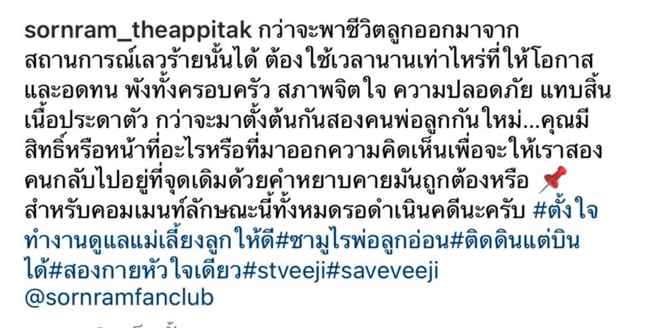 คุณมีสิทธิ์หรือหน้าที่อะไรหรือที่มาออกความคิดเห็นเพื่อจะให้เราสองคนกลับไปอยู่ที่จุดเดิมด้วยคำหยาบคายมันถูกต้องหรือ สำหรับคอมเมนท์ลักษณะนี้ทั้งหมดรอดำเนินคดีนะครับ #ตั้งใจทำงานดูแลแม่เลี้ยงลูกให้ดี#ซามูไรพ่อลูกอ่อน#ติดดินแต่บินได้#สองกายหัวใจเดียว#stveeji#saveveeji @sornramfanclub"