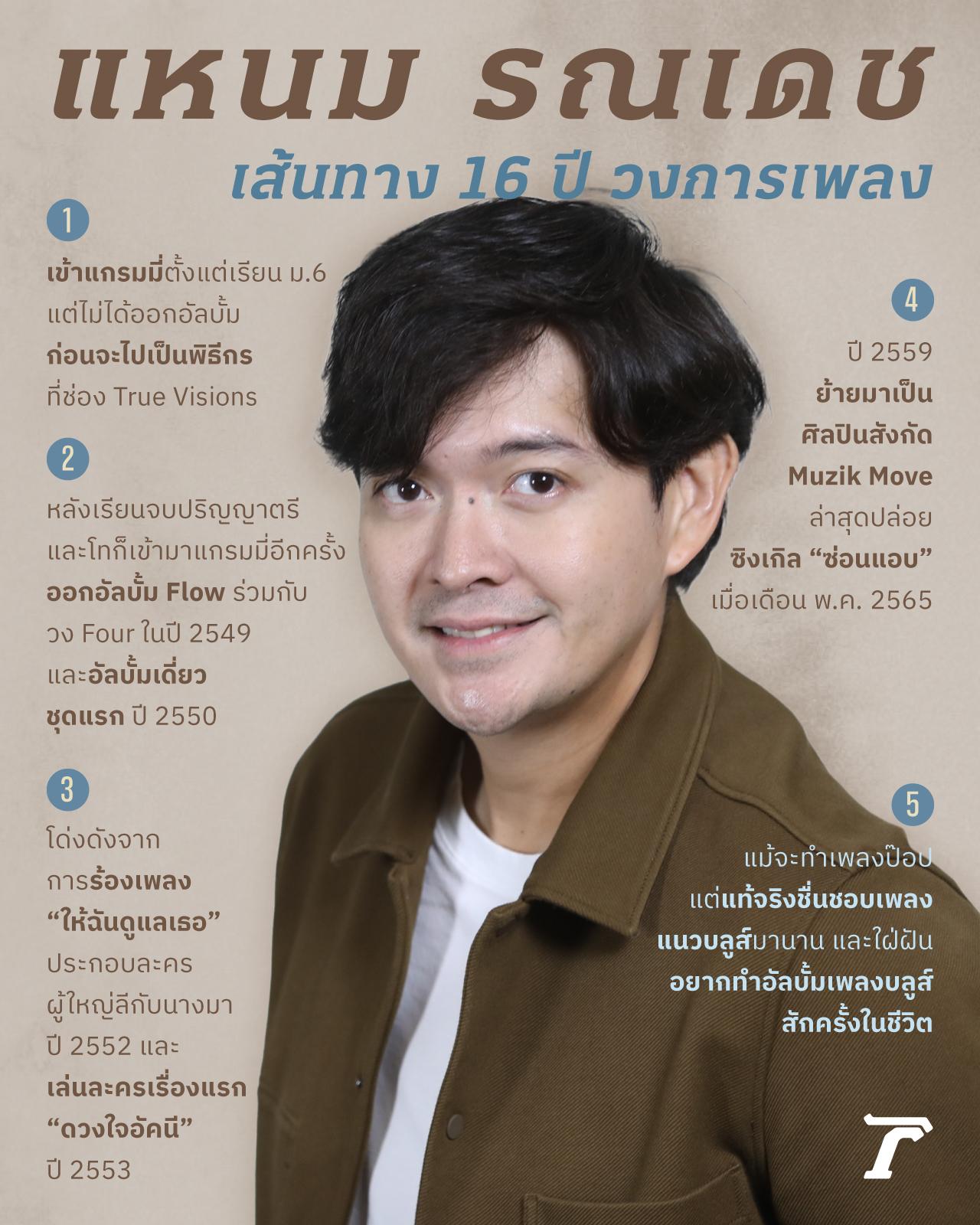 เราให้แหนมรีวิวตลอดชีวิตในวงการบันเทิงที่ผ่านมา เขาบอกว่า “มันก็ขึ้นๆ ลงๆ ครับ เราทำด้วยความชอบ ไม่ได้หวังว่าจะดังมาก แต่ก็มีช่วงที่แบบโห...บ้าง ช่วงไม่มีก็ผลัดๆ กันไป แต่ก็สนุกดีครับ การแสดงผมก็ชอบนะ แต่บางเรื่องบทบางอย่างก็เลือกไม่ได้ เราอาจจะไม่ได้มีชอยส์เยอะ แต่เพลงเราสามารถที่จะอยากทำแบบนั้นแบบนี้ได้บ้าง การแสดงเป็นบทที่เขาเลือกมาให้แล้ว ตอนเล่นเรื่องแรกก็บทเนี้ยบๆ หน่อย คนก็มองภาพเนี้ยบๆ มาตลอด ด้วยลุค ด้วยเพลง มันทำให้มาทางนั้นสักพักเลย พอผิดแนวนิดนึง คนจะรู้สึกว่าใช่เหรอ