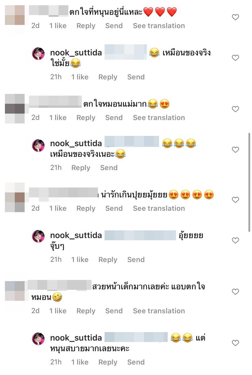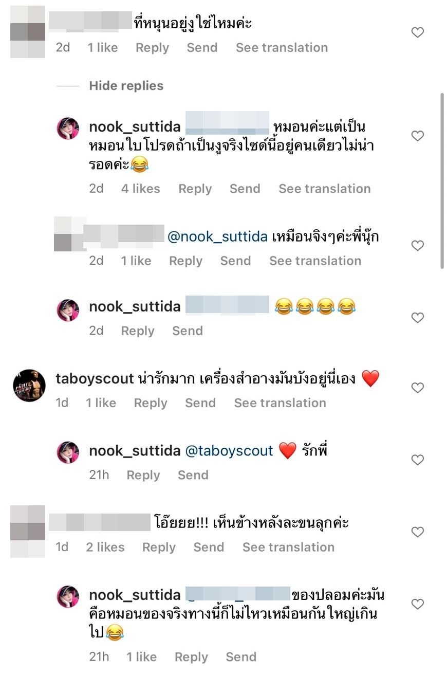 งานนี้ทำเอาแฟนๆ คอมเมนต์ชื่นชมความหน้าเด็กน่ารักของนุ๊ก บ้างก็บอกว่าเข้าใจความเป็นมนุษย์แม่จริงๆ แต่ก็มีหลายคนที่โฟกัสที่หมอนลายงูของนุ๊กและคอมเมนต์ว่า “ที่หนุนอยู่งูใช่ไหมค่ะ” ซึ่งนุ๊กตอบกลับว่า “หมอนค่ะแต่เป็นหมอนใบโปรดถ้าเป็นงูจริงไซด์นี้อยู่คนเดียวไม่น่ารอดค่ะ” รวมถึงคอมเมนต์ที่บอกว่า “โอ๊ยยย!!! เห็นข้างหลังละขนลุกค่ะ” และนุ๊กตอบกลับว่า “ของปลอมค่ะมันคือหมอนของจริงทางนี้ก็ไม่ไหวเหมือนกันใหญ่เกินไป”.