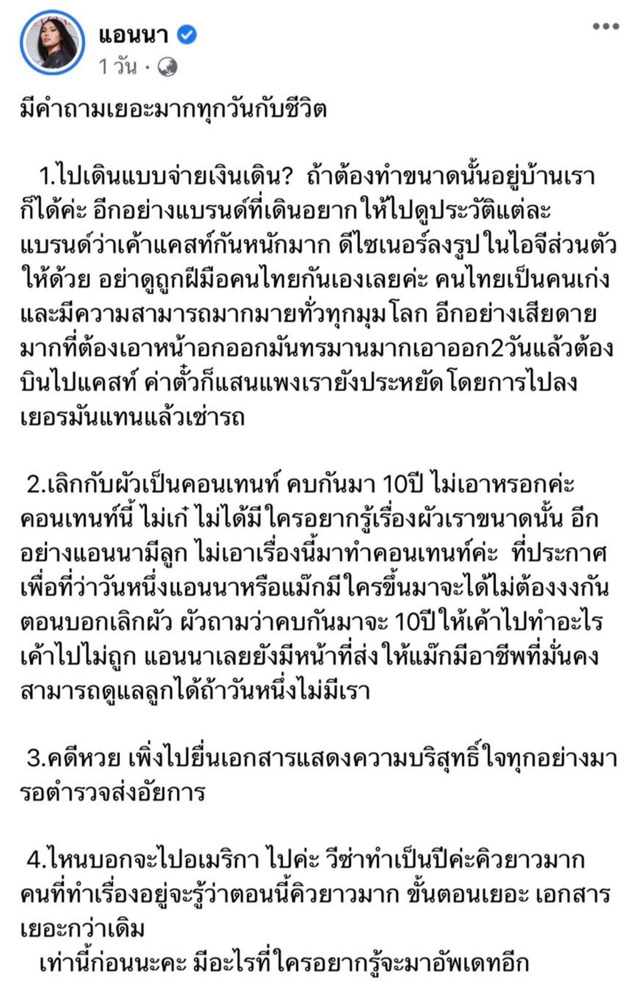 2.เลิกกับผัวเป็นคอนเทนต์ คบกันมา 10 ปี ไม่เอาหรอกค่ะคอนเทนต์นี้ ไม่เก๋ ไม่ได้มีใครอยากรู้เรื่องผัวเราขนาดนั้น อีกอย่างแอนนามีลูก ไม่เอาเรื่องนี้มาทำคอนเทนต์ค่ะ ที่ประกาศเพื่อที่ว่าวันหนึ่งแอนนา หรือแม๊ก มีใครขึ้นมาจะได้ไม่ต้องงงกัน ตอนบอกเลิกผัว ผัวถามว่าคบกันมาจะ 10 ปีให้เค้าไปทำอะไรเค้าไปไม่ถูก แอนนาเลยยังมีหน้าที่ส่งให้แม๊กมีอาชีพที่มั่นคง สามารถดูแลลูกได้ถ้าวันหนึ่งไม่มีเรา