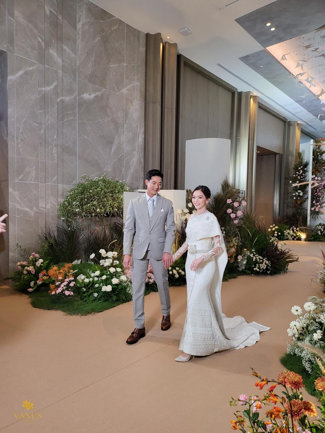 ส่วนเจ้าบ่าวนั้นมาในลุคชุดสูทสากลสีเทาอมฟ้า เสื้อตัวในเป็นเชิ้ตสีขาว สวมทับด้วยแจ็กเก็ตและชุดสูทที่ตัดเย็บจากผ้าวูลเนื้อดีที่สั่งนำเข้าจากอิตาลี เพิ่มดีเทลด้วยหูกระต่ายสีขาวและติดพินสูทที่สั่งทำขึ้นพิเศษที่อกข้างซ้าย เป็นอีกหนึ่งลุคคูลๆ ของเจ้าบ่าวสไตล์หนุ่มเวียร์ที่หล่อใจละลายไปเลย