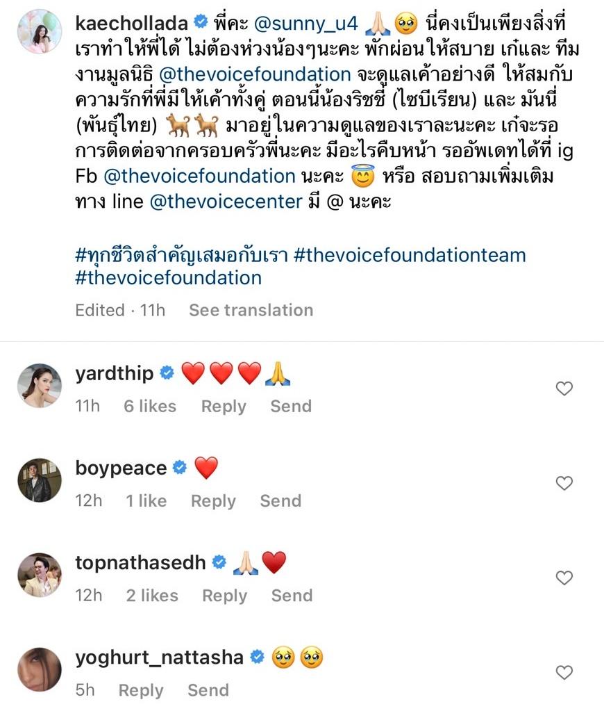 ล่าสุดนางแบบสาว เก๋ ชลลดา เมฆราตรี ประธานมูลนิธิ The Voice (เสียงจากเรา) ก็ได้โพสต์คลิปตอนที่เจ้าหน้าที่ไปรับ 2 น้องหมา คือ น้องริชชี่ สุนัขพันธุ์ไซบีเรียน และ น้องมันนี่ สุนัขพันธุ์ไทย พร้อมทั้งเขียนข้อความว่า “พี่คะ @sunny_u4 นี่คงเป็นเพียงสิ่งที่เราทำให้พี่ได้ ไม่ต้องห่วงน้องๆ นะคะ พักผ่อนให้สบาย เก๋และ ทีมงานมูลนิธิ @thevoicefoundation จะดูแลเค้าอย่างดี ให้สมกับความรักที่พี่มีให้เค้าทั้งคู่ ตอนนี้น้องริชชี่ (ไซบีเรียน) และ มันนี่ (พันธุ์ไทย) มาอยู่ในความดูแลของเราละนะคะ เก๋จะรอการติดต่อจากครอบครัวพี่นะคะ มีอะไรคืบหน้า รออัพเดทได้ที่ ig Fb @thevoicefoundation นะคะ หรือ สอบถามเพิ่มเติมทาง line @thevoicecenter มี @ นะคะ #ทุกชีวิตสำคัญเสมอกับเรา #thevoicefoundationteam #thevoicefoundation”