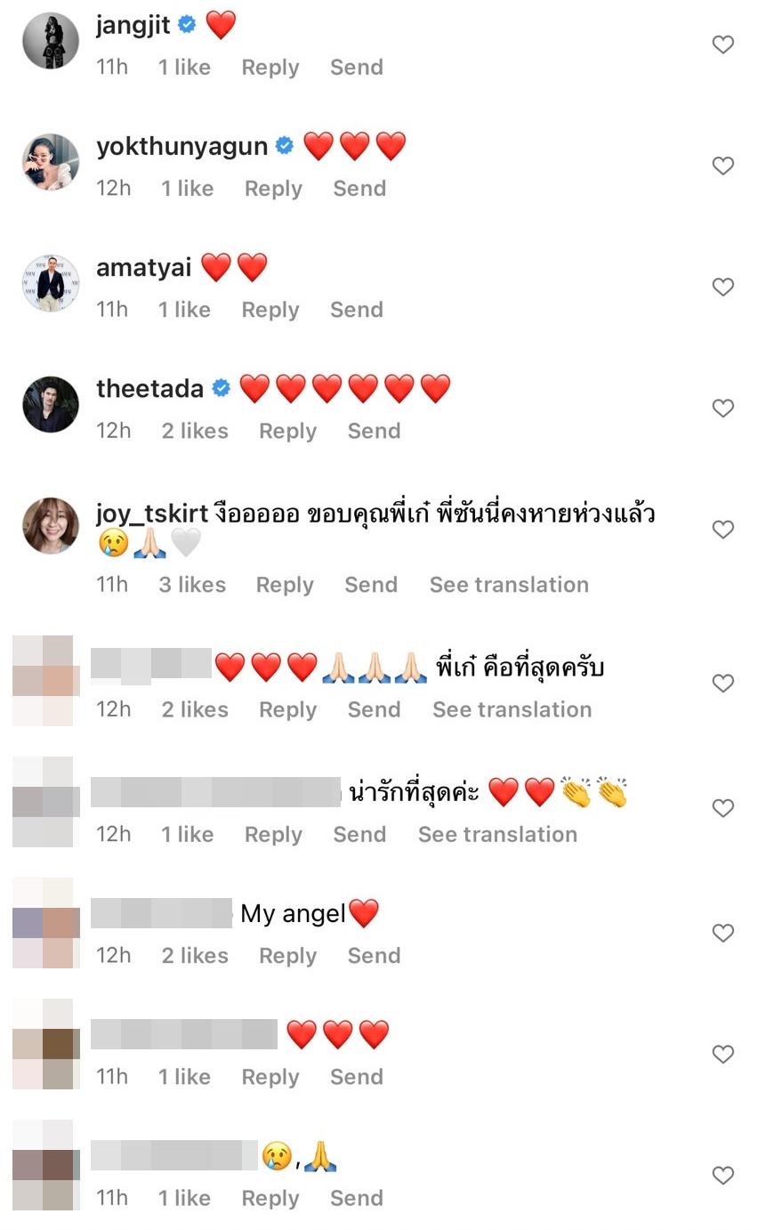 โดยมีทั้งคนในวงการบันเทิงรวมถึงแฟนๆ เข้ามาคอมเมนต์ส่งอีโมจิหัวใจและชื่นชมในความมีน้ำใจของ เก๋ ชลลดา ด้าน จอย ทีสเกิร์ต ก็คอมเมนต์ว่า “งือออออ ขอบคุณพี่เก๋ พี่ซันนี่คงหายห่วงแล้ว”.