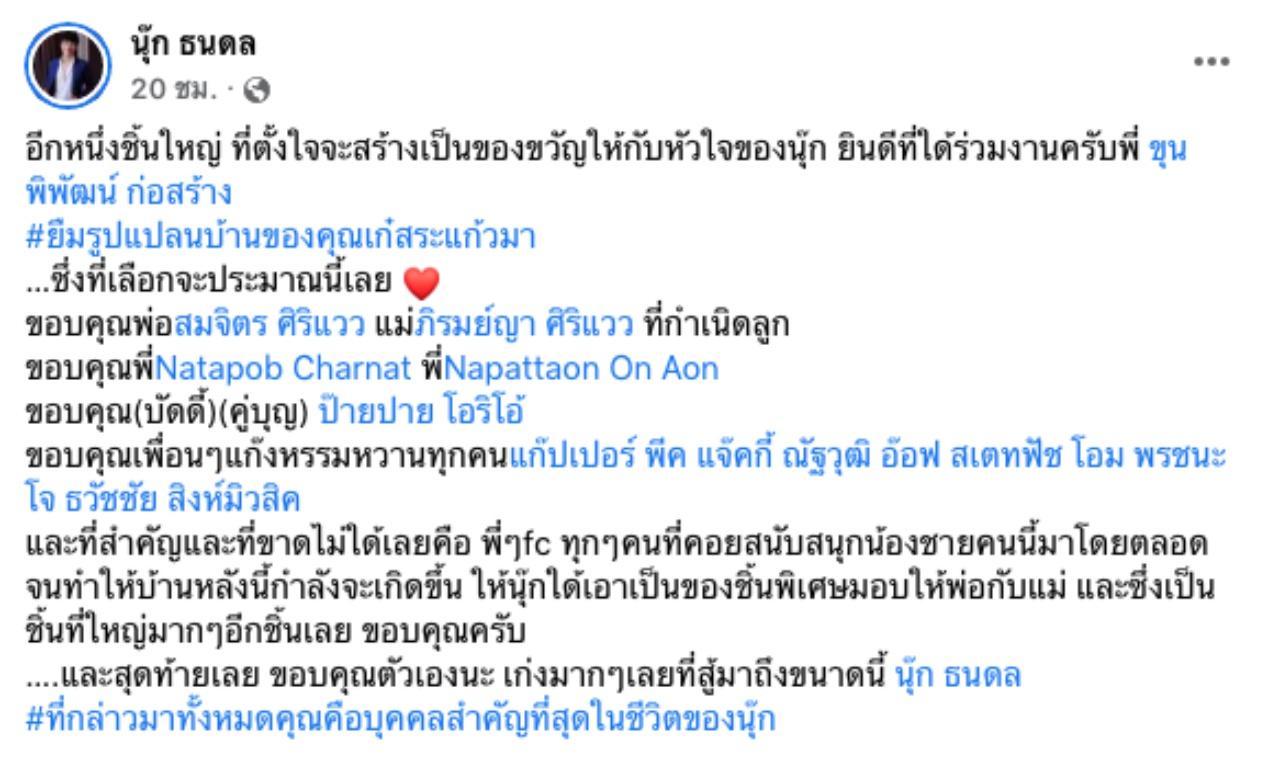 โดย นุ๊ก ธนดล ได้โพสต์ว่ากำลังตั้งใจจะสร้างบ้านเป็นของขวัญอีกหนึ่งให้กับหัวใจของ นุ๊ก ขอบคุณพ่อแม่ ที่กำเนิดลูก ขอบคุณบัดดี้คู่บุญ ป๊ายปาย โอริโอ้ พร้อมทั้งขอบคุณเพื่อนๆ และพี่ๆ FC ทุกคนที่คอยสนับสนุนน้องชายคนนี้มาโดยตลอด จนทำให้บ้านหลังนี้กำลังจะเกิดขึ้น ให้นุ๊กใด้เอาเป็นของชิ้นพิเศษมอบให้พ่อกับแม่ และซึ่งเป็นชิ้นที่ใหญ่มากๆอีกชิ้นเลย ขอบคุณครับ….และสุดท้ายเลย ขอบคุณตัวเองนะ เก่งมากๆเลยที่สู้มาถึงขนาดนี้ นุ๊ก ธนดล #ที่กล่าวมาทั้งหมดคุณคือบุคคลสำคัญที่สุดในชีวิตของนุ๊กชิ้นใหญ่