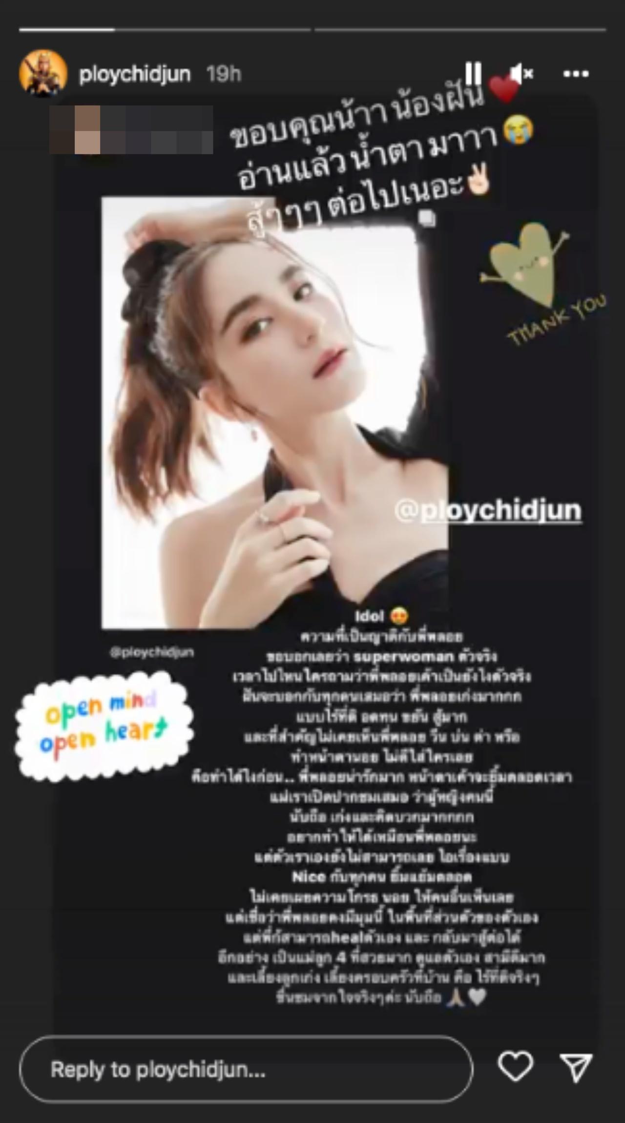 นอกจากนี้ พลอย ชิดจันทร์ ยังได้รีโพสต์สตอรี่ของญาติที่มีข้อความชื่นชมตัวเธอ พี่พลอยคือ superwoman พี่พลอยเก่งมากแบบไร้ที่ติ อดทน ขยัน สู้มาก ไม่เคยเห็น วีน บ่น ด่าหรือทำหน้านอยด์ไม่ดีใส่ใคร หน้าตายิ้มตลอดเวลา เก่งและคิดบวกมาก ไม่เคยโกรธใครให้เห็น แต่เชื่อว่าพี่พลอยคงมีมุมนี้ในพื้นที่ส่วนตัวของตัวเอง พี่สามารถ Heal ตัวเองและกลับมาสู้ได้ เป็นแม่ลูก 4 ที่ดูแลตัวเอง สามีดีมาก และเลี้ยงลูกเก่ง เลี้ยงครอบครัวที่บ้าน ไร้ที่ติ ชื่นชมจากใจ ซึ่งพลอยได้รีโพสต์แล้วบอกว่า อ่านแล้วน้ำตามา สู้ๆ ต่อไป.