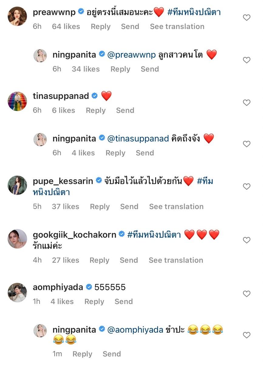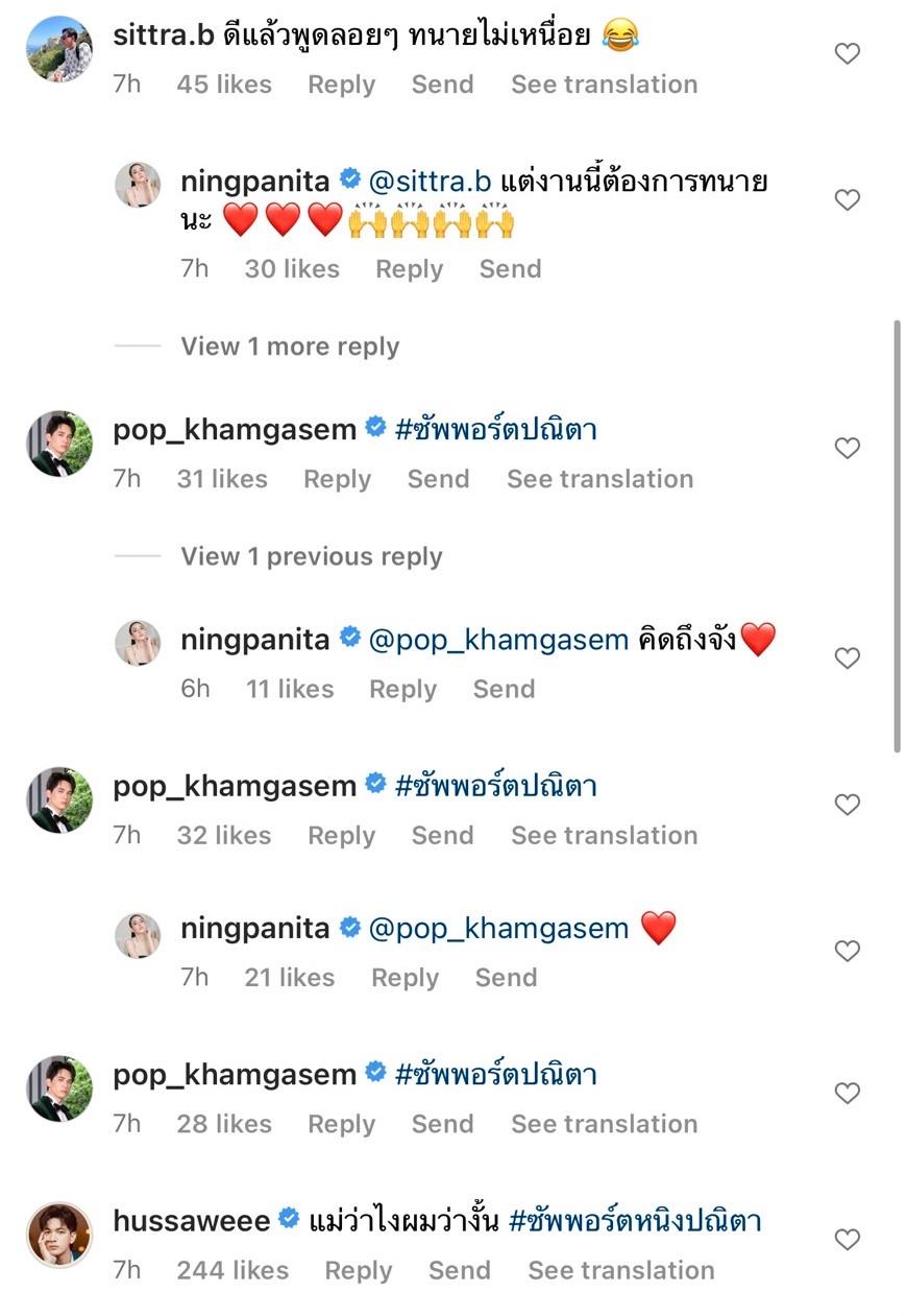งานนี้ทำเอาคนในวงการบันเทิงต่างเข้ามาแสดงความคิดเห็น อาทิ มิกค์ ทองระย้า, กระแต ศุภักษร, เมย์ เฟื่องอารมย์, เข้ม หัสวีร์, เปรี้ยว ทัศนียา ฯลฯ ด้านสามีอย่าง จิน จรินทร์ ก็แสดงความคิดเห็นว่า “#ทีมคุณปณิตา เบื่อไฮโซ Hiso” และใส่อีโมจินิ้วโป้งคว่ำ รวมไปถึงชาวเน็ตที่ต่างเข้ามาให้กำลังใจนับร้อยข้อความ.