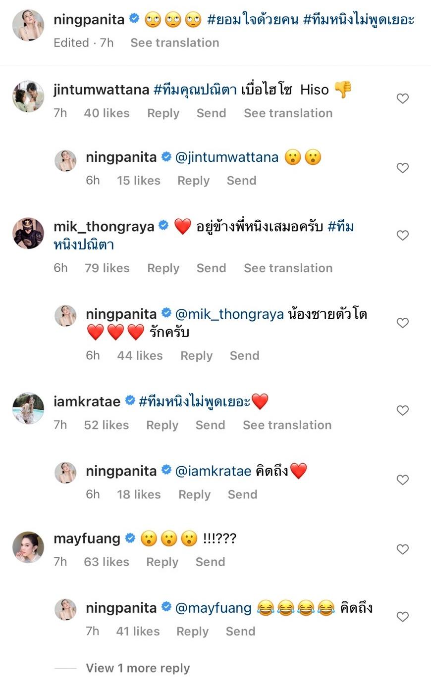 โดย หนิง ปณิตา โพสต์ภาพข้อความที่เขียนว่า “สร้างภาพ PR จะวงการไหนก็ไม่ต่างกัน บางคนอยู่วงการไฮโซ แต่ทำตัวยิ่งกว่านี้ #ฝากไว้ให้ทบทวน” พร้อมทั้งใส่แคปชั่นเป็นอีโมจิมองบนและติดแฮชแท็ก #ยอมใจด้วยคน #ทีมหนิงไม่พูดเยอะ