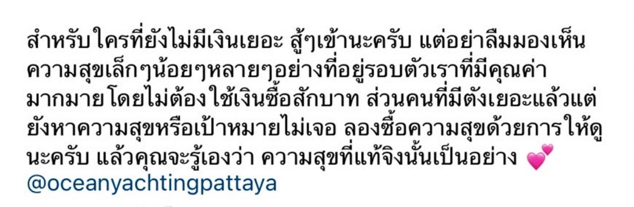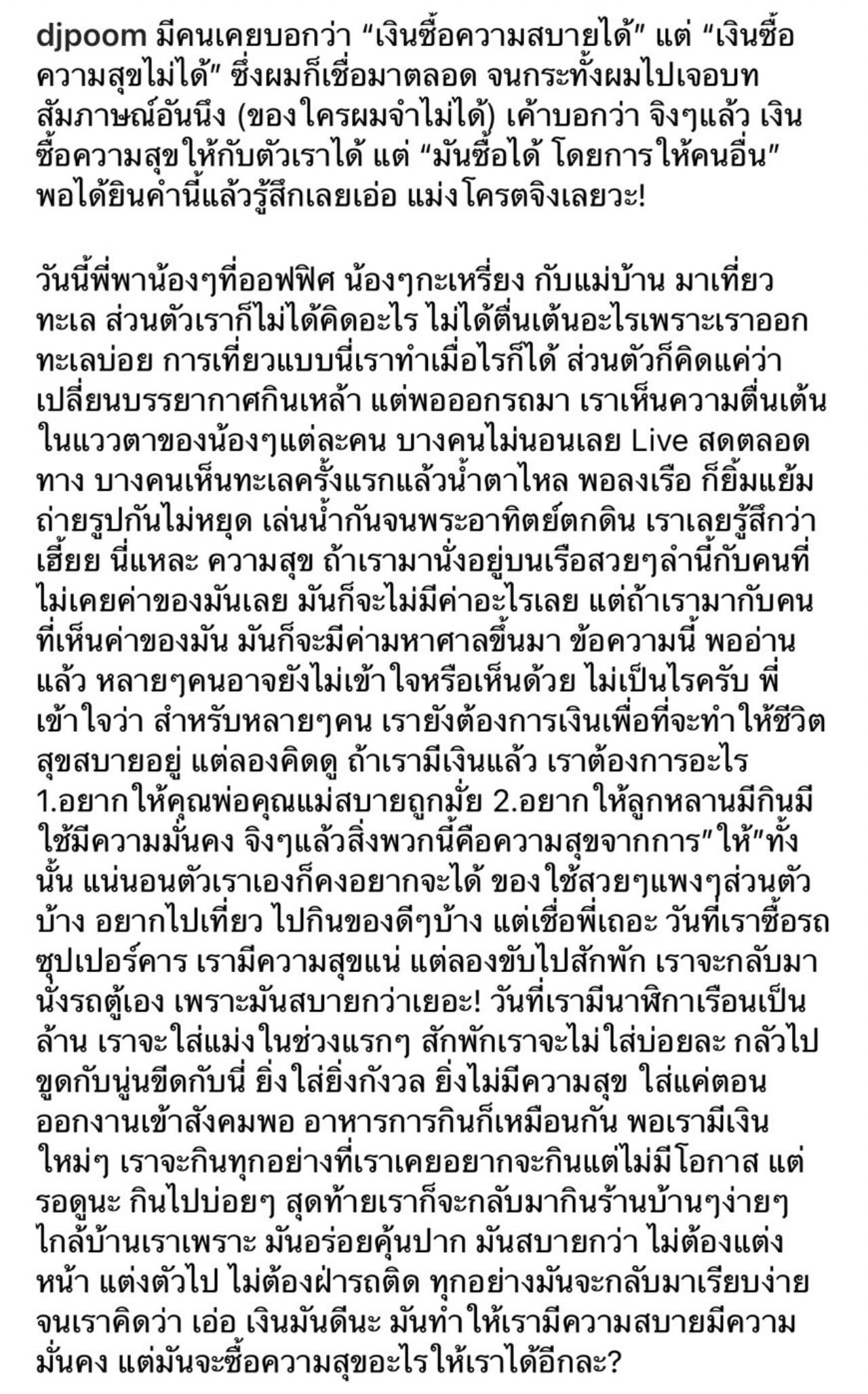 เราเลยรู้สึกว่า เฮี้ยย นี่แหละ ความสุข ถ้าเรามานั่งอยู่บนเรือสวยๆ ลำนี้กับคนที่ไม่เคยค่าของมันเลย มันก็จะไม่มีค่าอะไรเลย แต่ถ้าเรามากับคนที่เห็นค่าของมัน มันก็จะมีค่ามหาศาลขึ้นมา ข้อความนี้ พออ่านแล้ว หลายๆ คนอาจยังไม่เข้าใจหรือเห็นด้วย ไม่เป็นไรครับ พี่เข้าใจว่า สำหรับหลายๆ คน เรายังต้องการเงินเพื่อที่จะทำให้ชีวิตสุขสบายอยู่