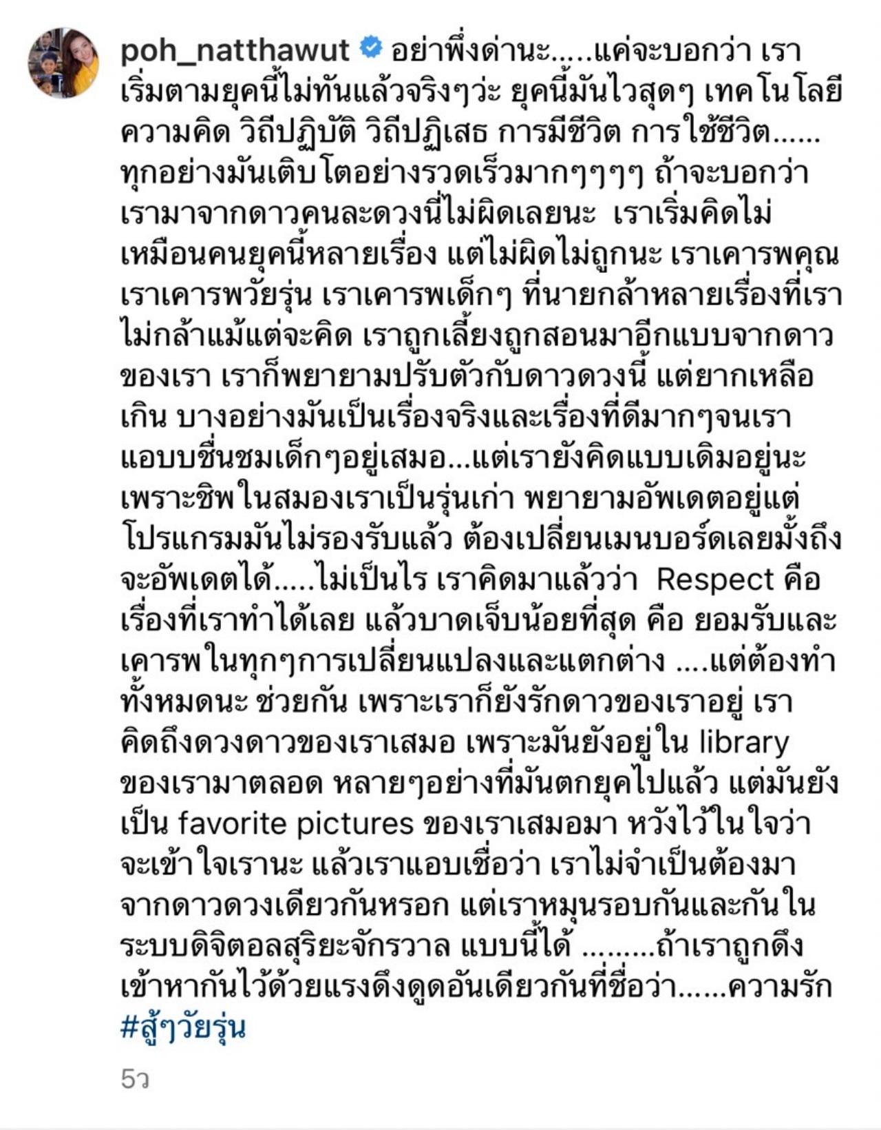 "อย่าพึ่งด่านะ…..แค่จะบอกว่า เราเริ่มตามยุคนี้ไม่ทันแล้วจริงๆว่ะ ยุคนี้มันไวสุดๆ เทคโนโลยี ความคิด วิถีปฏิบัติ วิถีปฏิเสธ การมีชีวิต การใช้ชีวิต……ทุกอย่างมันเติบโตอย่างรวดเร็วมากๆๆๆๆ ถ้าจะบอกว่าเรามาจากดาวคนละดวงนี่ไม่ผิดเลยนะ เราเริ่มคิดไม่เหมือนคนยุคนี้หลายเรื่อง แต่ไม่ผิดไม่ถูกนะ เราเคารพคุณ เราเคารพวัยรุ่น เราเคารพเด็กๆ ที่นายกล้าหลายเรื่องที่เราไม่กล้าแม้แต่จะคิด