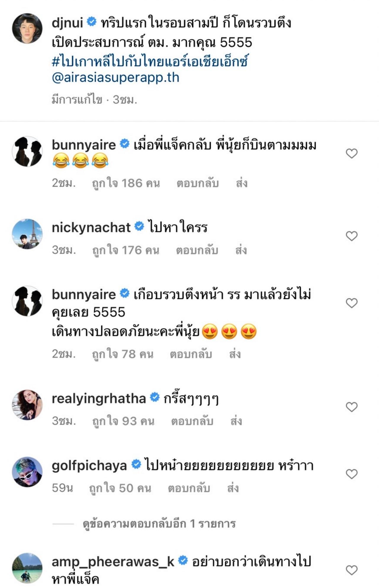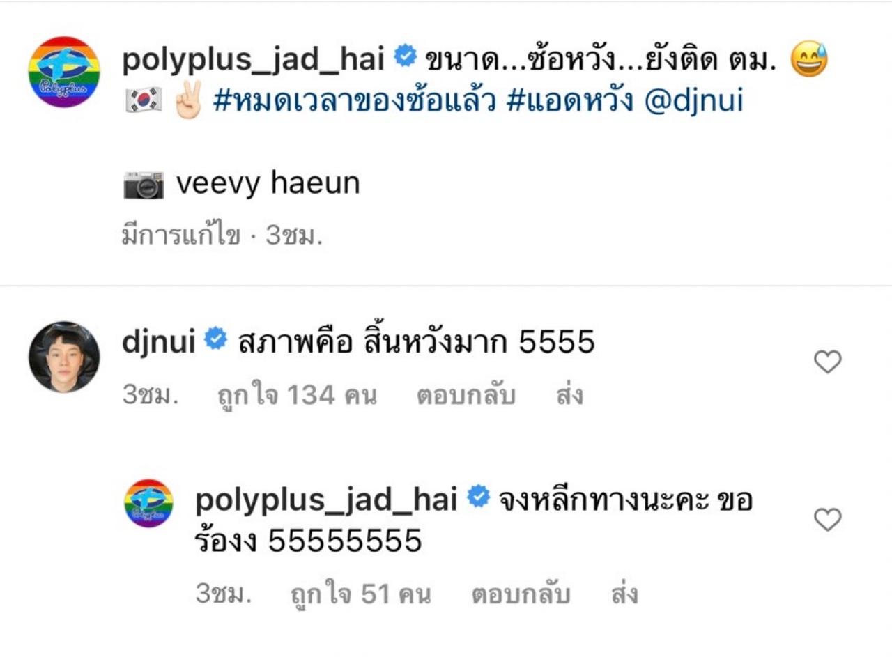 และในอินสตาแกรมของ ดีเจนุ้ย เองก็ได้โพสต์ภาพนั่งยิ้มอยู่บนเครื่องบิน พร้อมเขียนข้อความว่า "ทริปแรกในรอบสามปี ก็โดนรวบตึง เปิดประสบการณ์ ตม. มากคุณ 5555" และในอินสตาแกรมของ polyplus_jad_hai ก็ได้โพสต์ภาพของดีเจนุ้ยเช่นกัน และเขียนว่า "ขนาด...ซ้อหวัง...ยังติด ตม. #หมดเวลาของซ้อแล้ว #แอดหวัง @djnui" ด้าน ดีเจนุ้ย ก็ได้เข้ามาตอบกลับว่า "สภาพคือ สิ้นหวังมาก 5555".