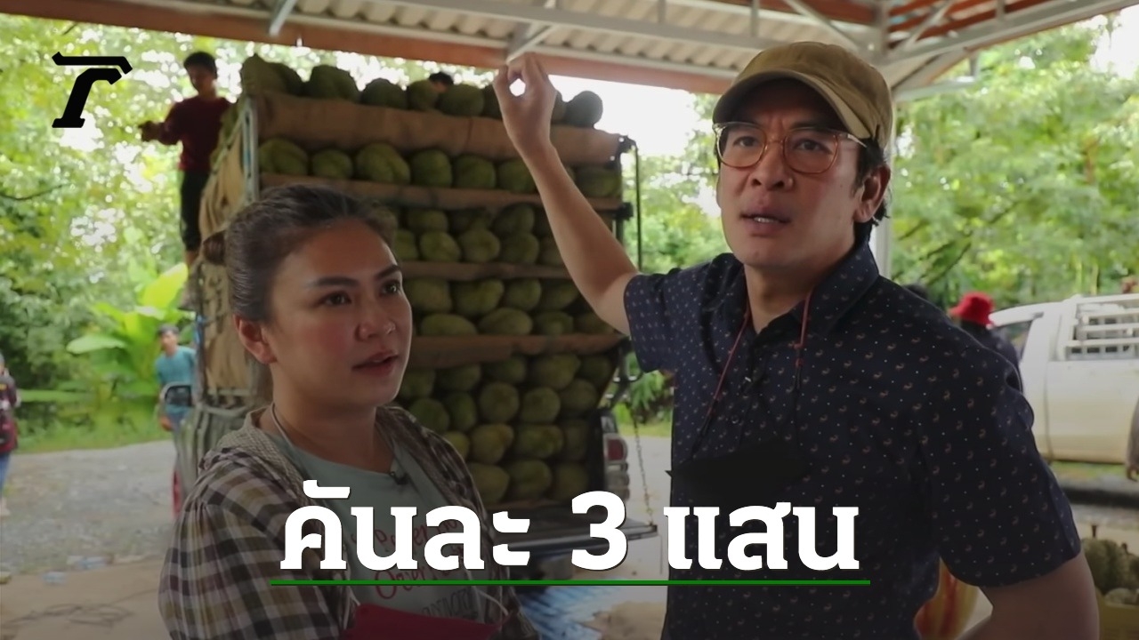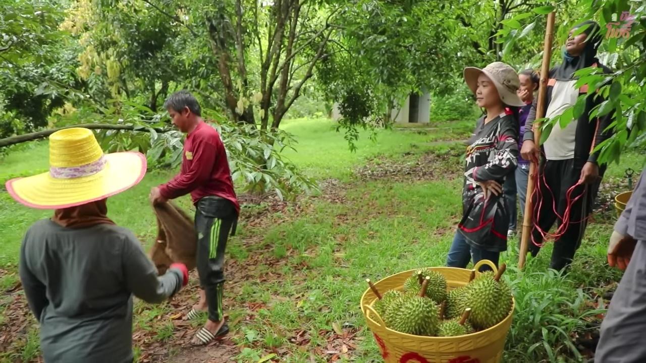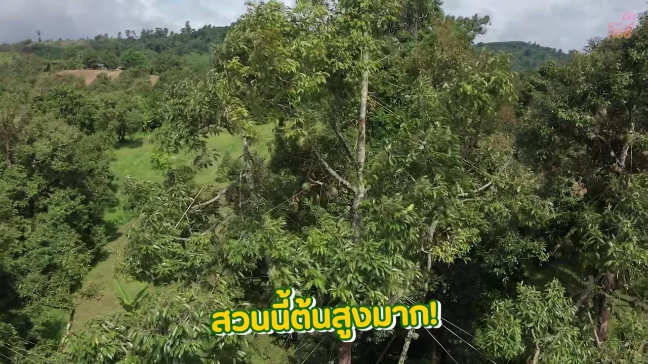 จากนั้น ชาคริต-แอน พาไปสวนตัวเองที่เรียกว่าเป็นสวนปราบเซียน เพราะต้นทุเรียนสูงมาก มือตัดรับงานนี้ยังมีหวั่นใจ ชาคริตบอกว่าบันไดเจ๊งไปแล้ว 1 อัน เพิ่งถอยมาใหม่ ก่อนจะบ่นขำๆ ว่าคนบ้าอะไรซื้อบันไดเป็นหมื่น พร้อมทั้งบอกว่าพอต้นทุเรียนสูง เวลาโยนลงมาก็ต้องระวังมาก คนตัดทุเรียนต้องมีความชำนาญ เพราะอันตราย ต้องมีเทคนิครวมถึงประสบการณ์ ซึ่งต้นที่สูงๆ อายุ 40 กว่าปีแล้ว บางต้นอยู่ริมน้ำ ก็ต้องใช้เทคนิคตัดแบบไม่ให้ตกน้ำ จึงทำให้ทุเรียนมีราคาแพง