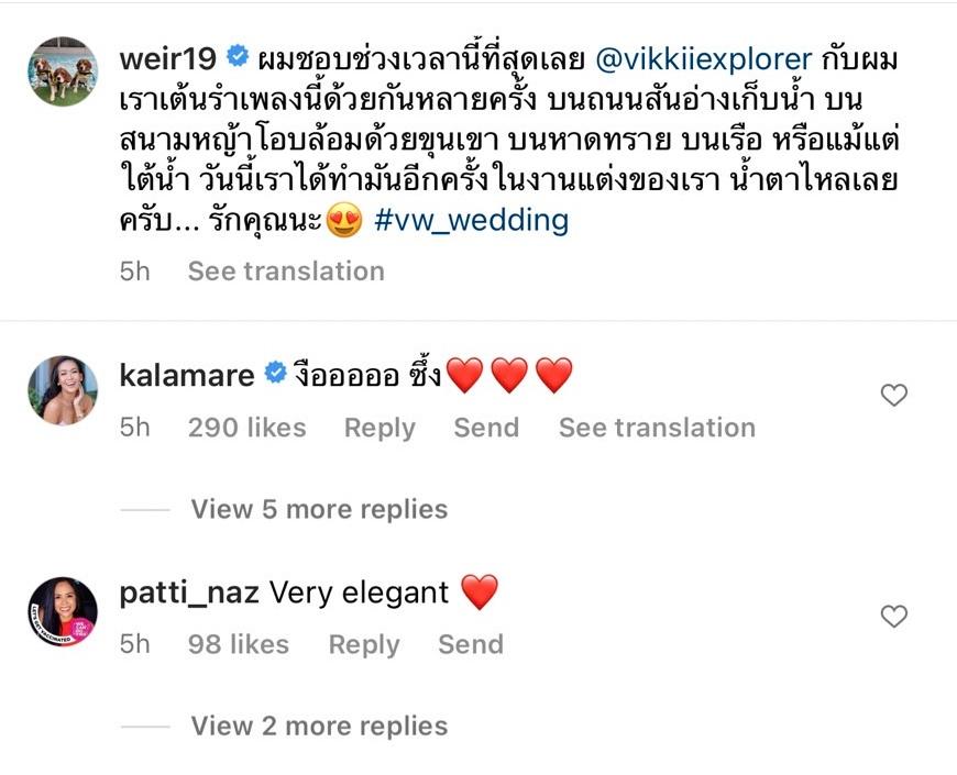 โดยมีแฟนๆ เข้ามาคอมเมนต์แสดงความคิดเห็นหลายร้อยข้อความ ด้าน กาละแมร์ พัชรศรี ก็แสดงความคิดเห็น “งือออออ ซึ้ง” รวมไปถึง คุณแม่แหม่ม พลอยไพลิน คุณแม่ของเวียร์ คอมเมนต์ว่า “Very elegant” ด้วย.