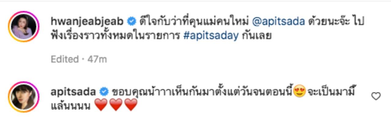 "ดีใจกับว่าที่คุนแม่คนใหม่ @apitsada ด้วยนะจ๊ะ ไปฟังเรื่องราวทั้งหมดในรายการ #apitsaday กันเลย" ด้าน ไอซ์ ก็ได้เข้ามาตอบกลับว่า "ขอบคุณน้าาาเห็นกันมาตั้งแต่วันจนตอนนี้ จะเป็นมามี๊แล้นนนน"
