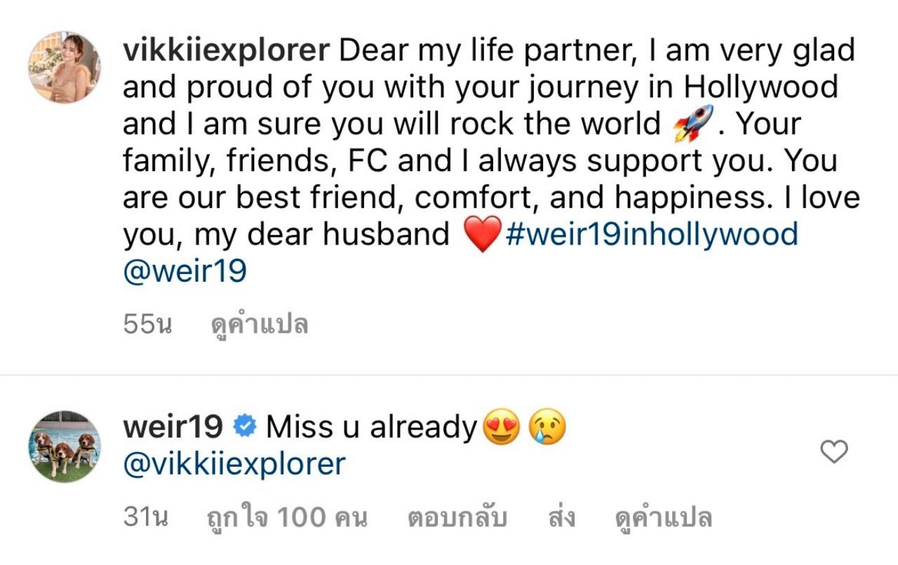 งานนี้สามีสุดที่รัก เวียร์ ศุกลวัฒน์ ก็ได้เข้ามาคอมเมนต์ตอบกลับ วิกกี้ ภรรยาของตัวเองว่า "Miss u already" อีกด้วย.