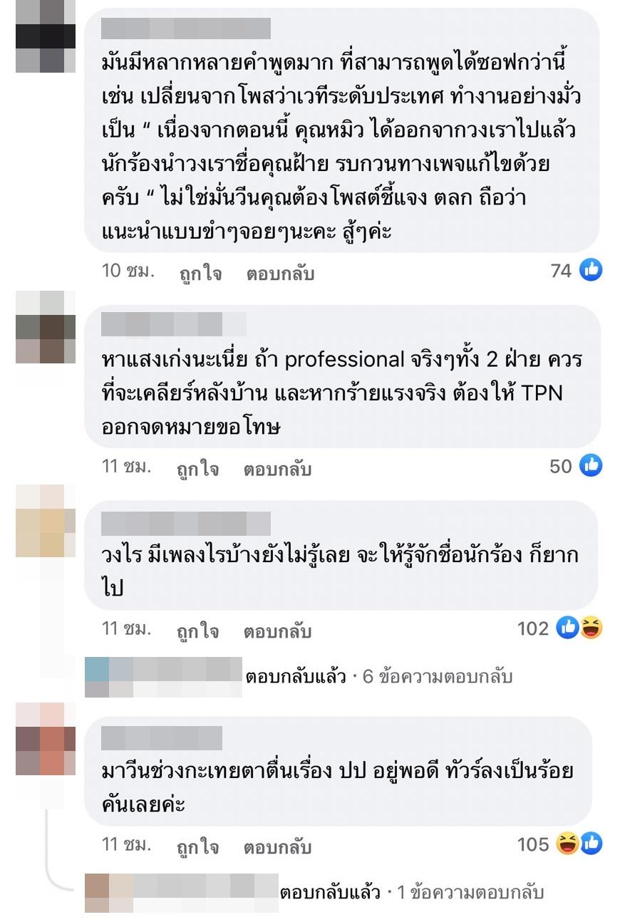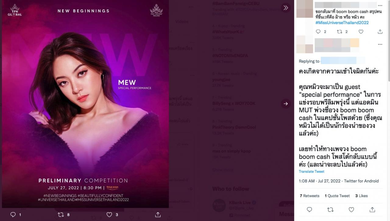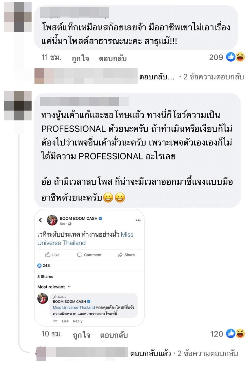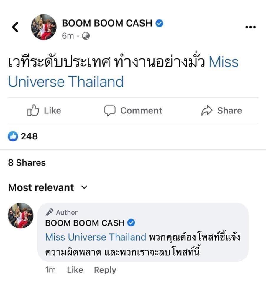 โดยเพจ BOOM BOOM CASH โพสต์ข้อความว่า “เวทีระดับประเทศ ทำงานอย่างมั่ว” พร้อมทั้งแท็กไปที่เพจ Miss Universe Thailand และเขียนคอมเมนต์ใต้โพสต์ว่า “พวกคุณต้องโพสต์ชี้แจงความผิดพลาด และพวกเราจะลบโพสต์นี้” และข้อความ “นักร้องวงเราชื่อฝ้าย (อีโมจิยกมือไหว้) รบกวนอย่าโปรโมตมั่ว นี่เวทีระดับประเทศนะ”