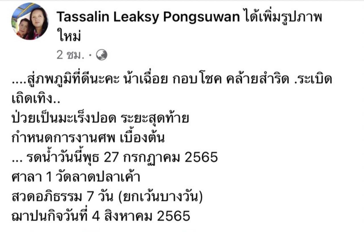 โดยเพื่อนได้โพสต์แจ้งความผ่านเฟซบุ๊กว่า น้าเฉื่อย ระเบิดเถิดเทิง หรือ กอบโชค คล้ายสำริด ได้เสียชีวิตแล้ว หลังป่วยมะเร็งปอดระยะสุดท้าย ส่วนกำหนดการพิธีฌาปนกิจ จะมีกำหนดรดน้ำศพในวันพุธ 27 ก.ค. 2565 ที่ศาลา 1 วัดลาดปลาเค้า สวดพระอภิธรรม 7 วัน และฌาปนกิจ 4 ส.ค. 2565 หลายคนที่ติดตามต่างเข้ามาร่วมแสดงความเสียใจกันเป็นจำนวนมาก.