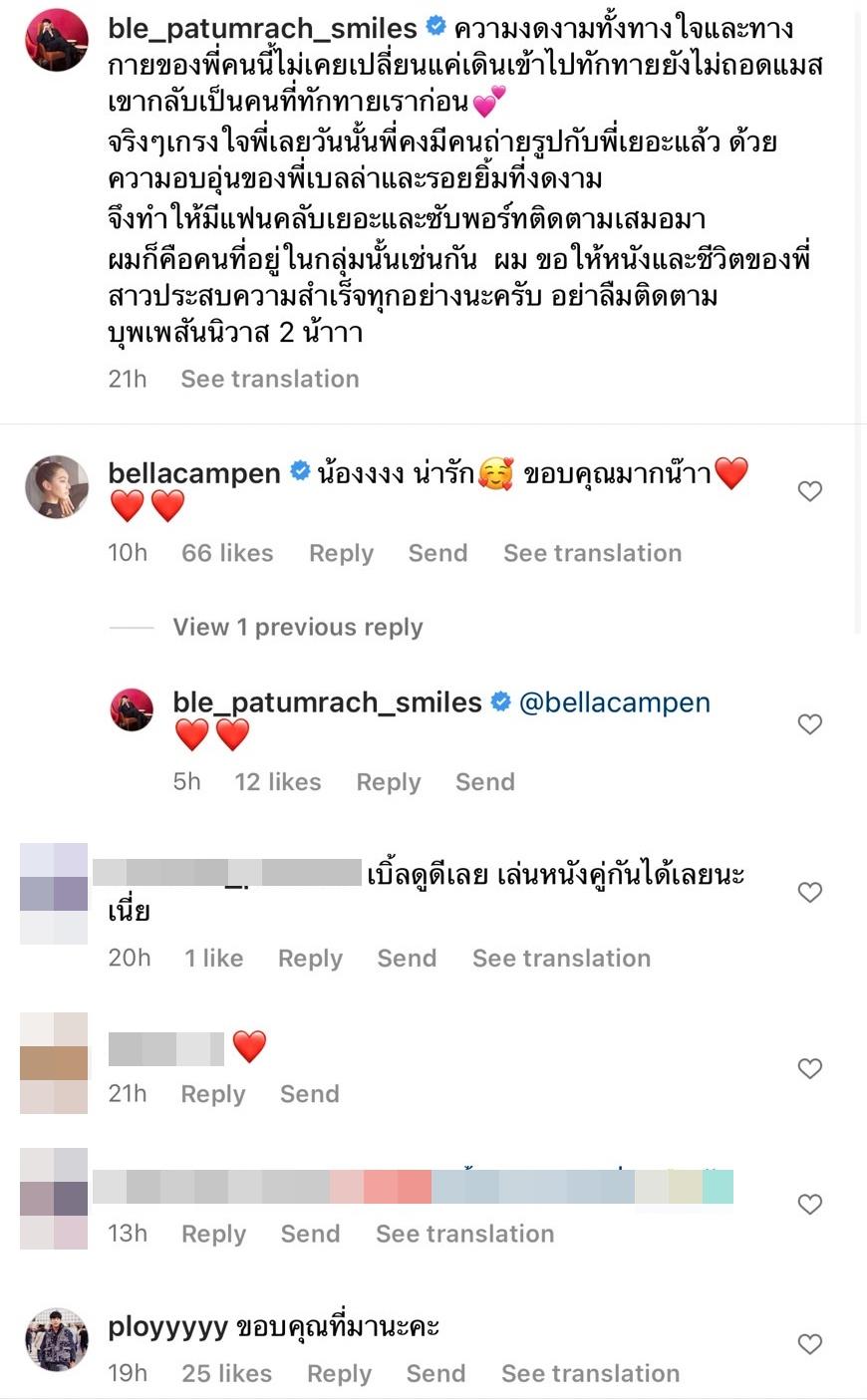 งานนี้นอกจากจะมีแฟนๆ เข้ามาคอมเมนต์ชื่นชมทั้งเบลล่าและเบิ้ลแล้ว ด้านคนในรูปอย่างเบลล่าก็เข้ามาคอมเมนต์ตอบกลับว่า “น้องงงง น่ารัก ขอบคุณมากน้าา” และใส่อีโมจิหัวใจ 2 ดวง ด้านเบิ้ลก็ตอบกลับเป็นอีโมจิหัวใจด้วย ส่วน พลอย ผู้จัดการส่วนตัวของเบลล่า ก็คอมเมนต์ว่า "ขอบคุณที่มานะคะ".