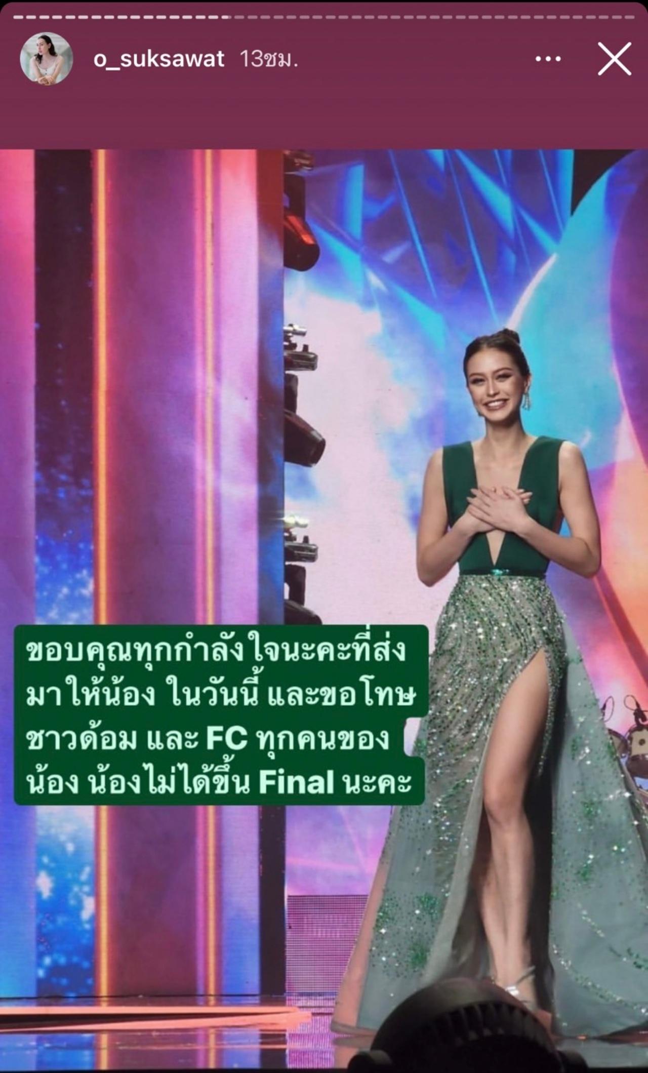 ด้าน คุณโอ ซึ่งเป็นพี่เลี้ยงนางงาม ที่ส่ง เป๊ปปี้ เข้าประกวดก็ได้โพสต์ข้อความผ่านไอจีสตอรี่ว่า "ขอบคุณทุกกำลังใจนะคะที่ส่งมาให้น้องในวันนี้ และขอโทษชาวด้อม และ FC ทุกคนของน้อง น้องไม่ได้ขึ้น Final นะคะ"