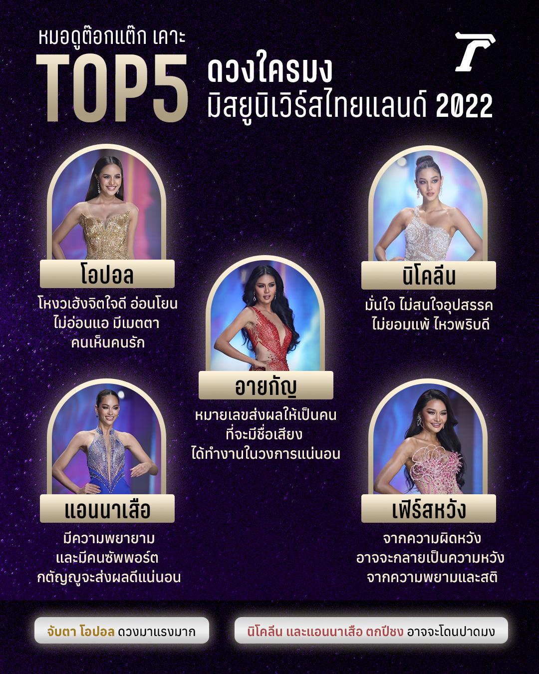 - ต๊อกแต๊ก A4 หมอดูชื่อดัง ส่องดวงเคาะโพล TOP5 มิสยูนิเวิร์สไทยแลนด์ 2022