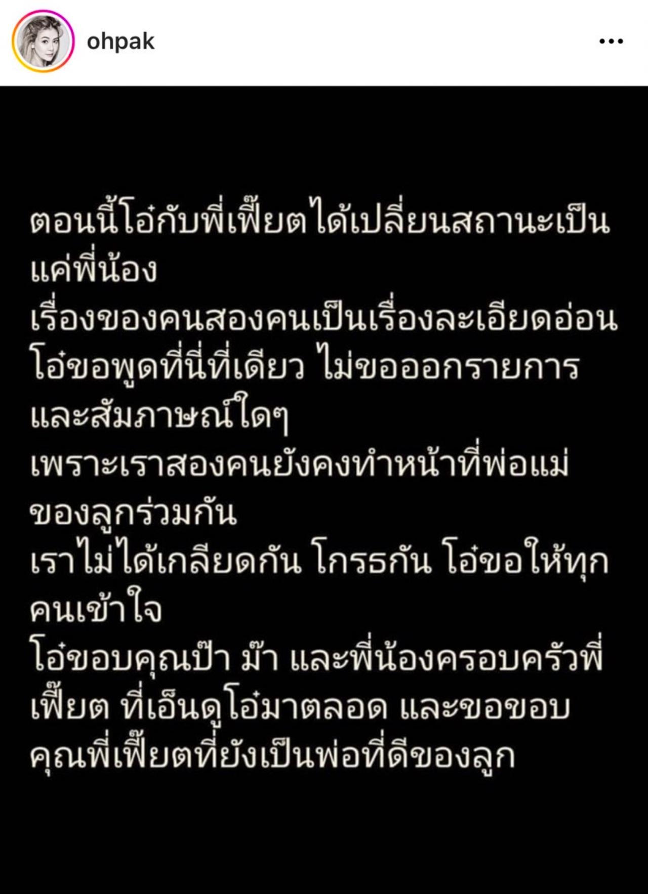 ที่ผ่านมา โอ๋ มักโดนถามเสมอเรื่องกับสามีว่ายังเหมือนเดิมกันมั้ย จนในที่สุดก็เกิดข่าวช็อก โอ๋ได้ออกมาประกาศว่า ลดสถานะกับพี่เฟี๊ยตเหลือเพียงพี่น้องที่ดีต่อกัน.